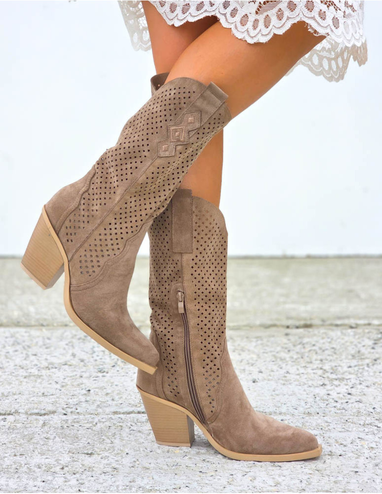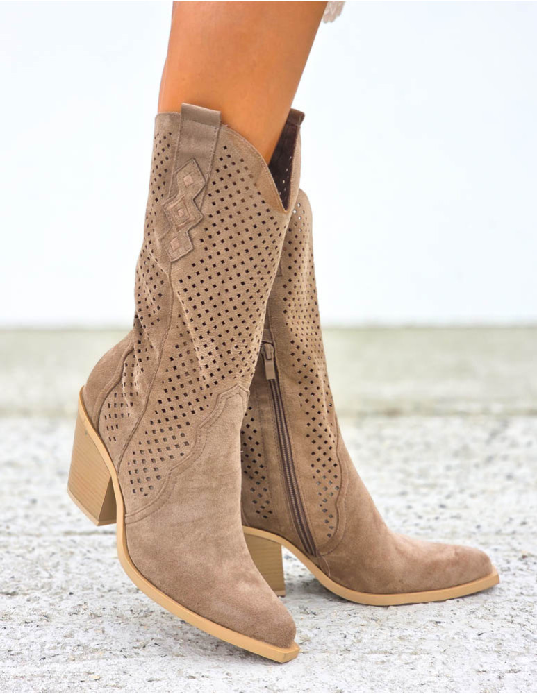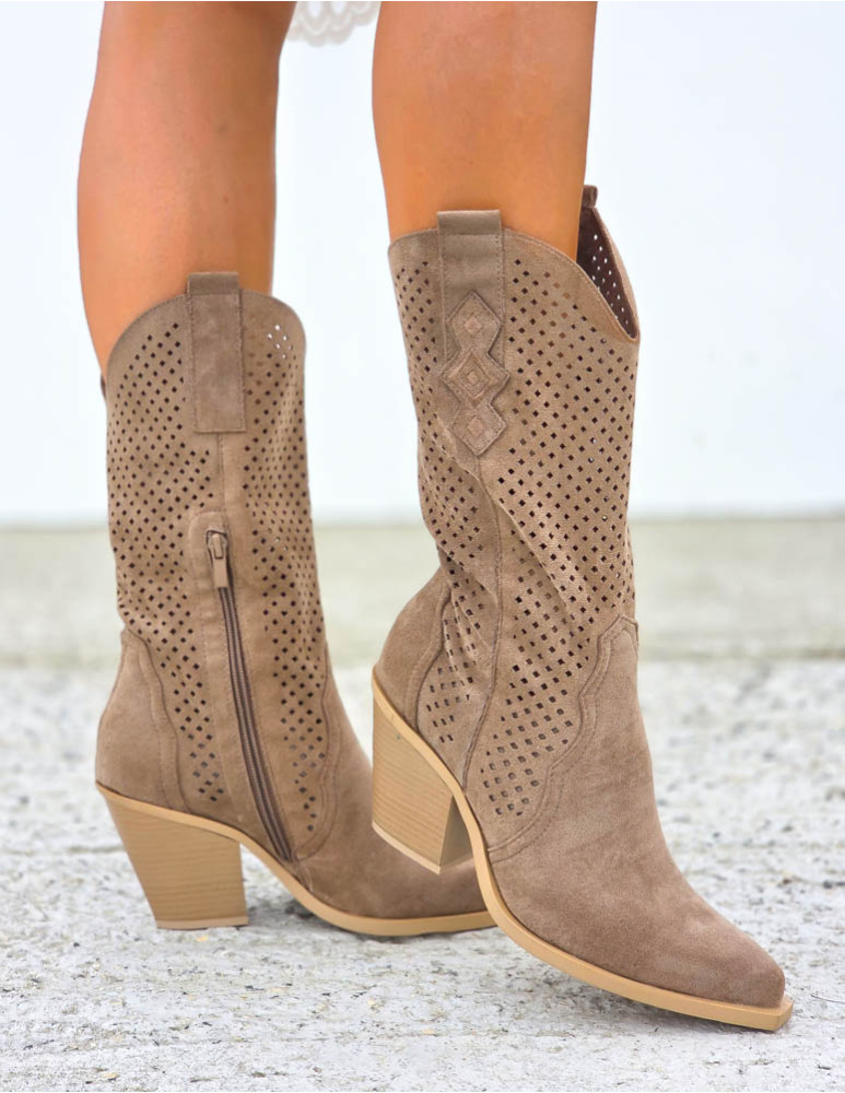 Beżowe Zamszowe Ażurowe Botki Na Słupku Paula