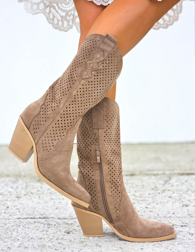 Ażurowe Brązowe Zamszowe Kozaki Kowbojki California