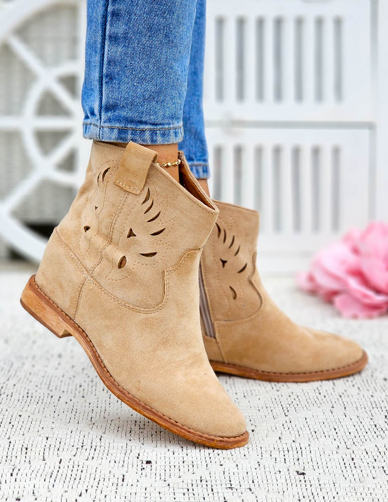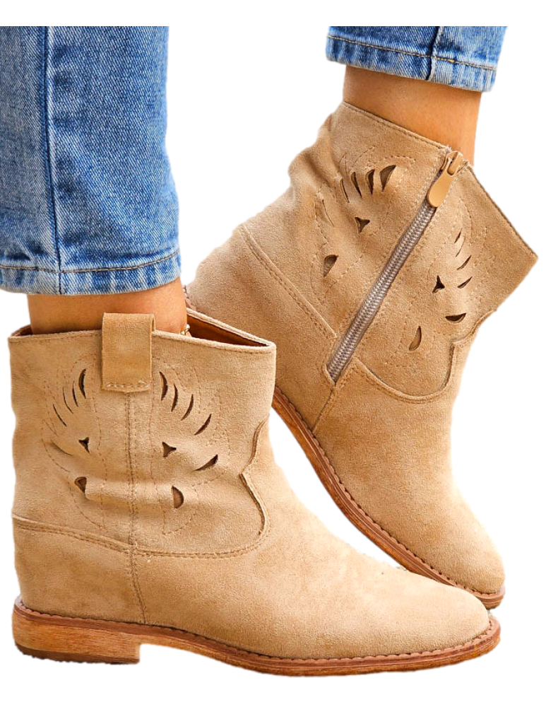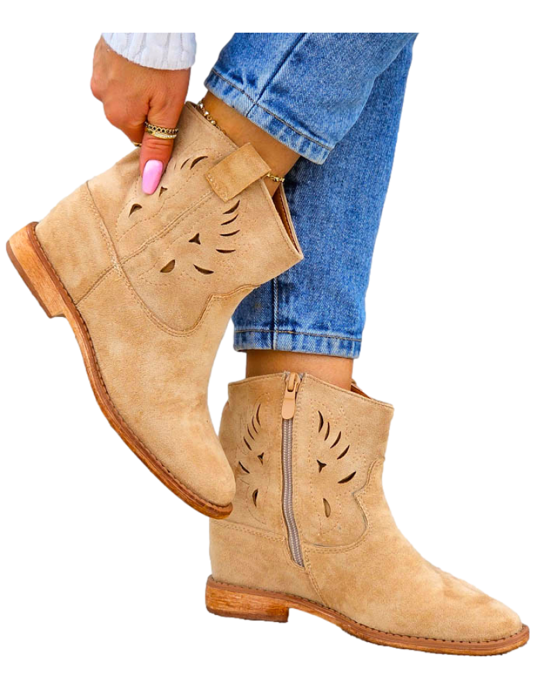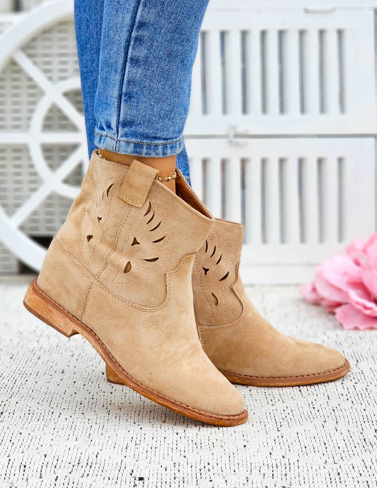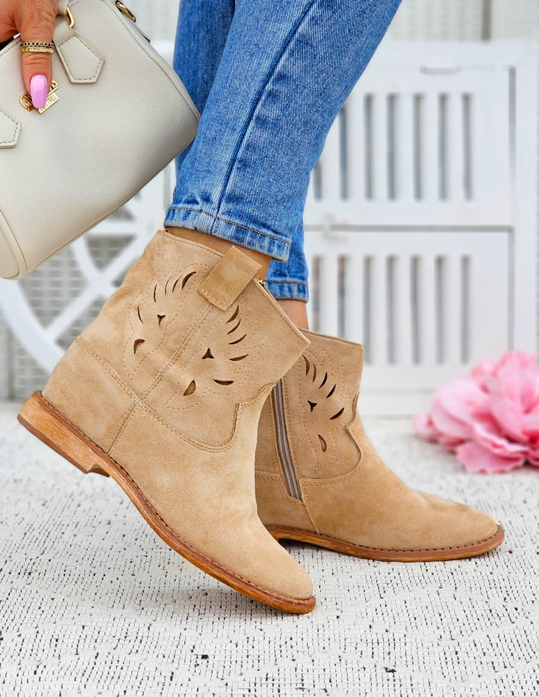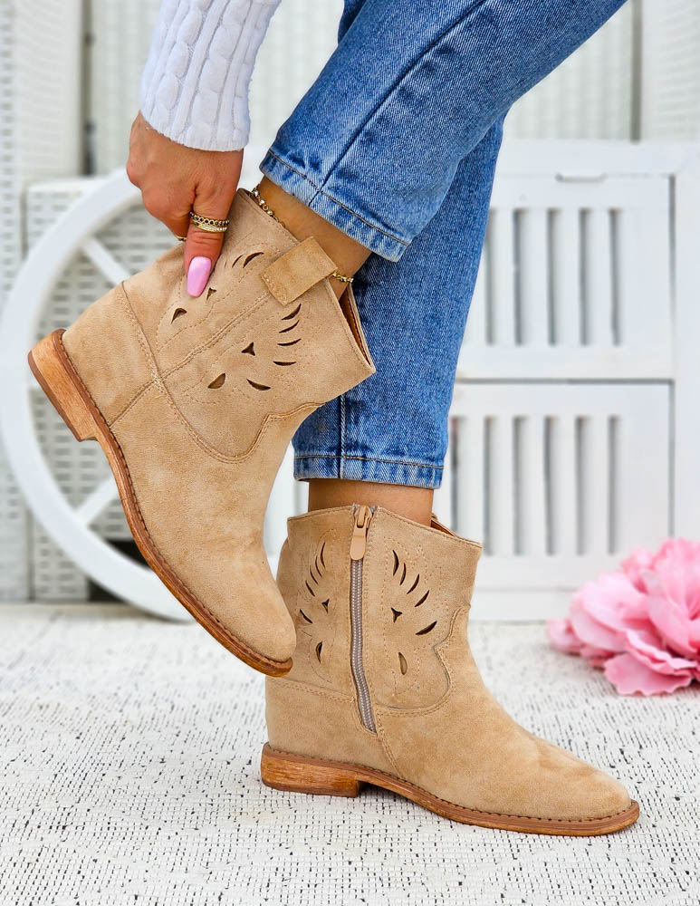 Beżowe Zamszowe Botki Kowbojki Damskie Loren