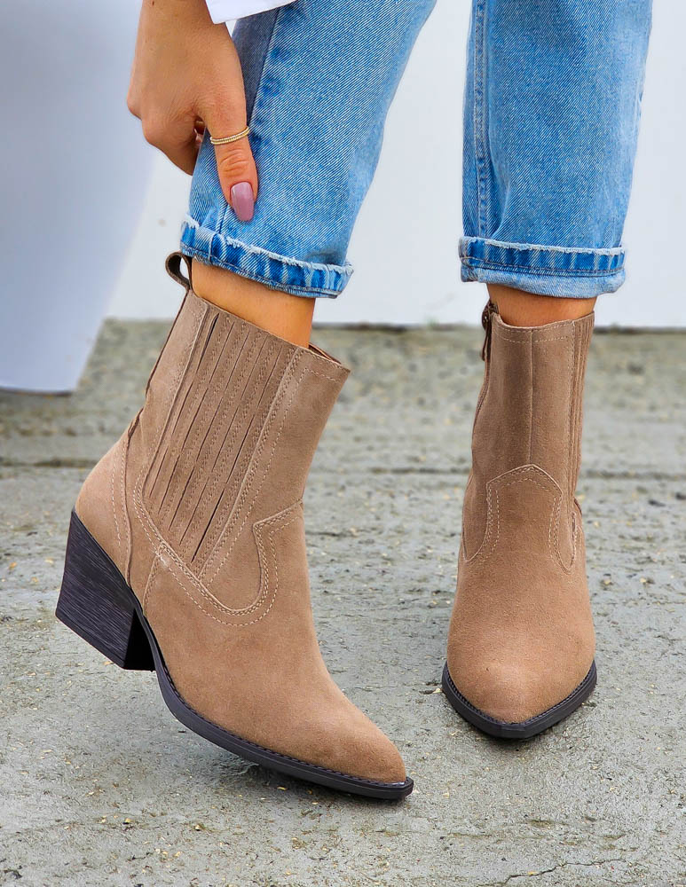 Beżowe Zamszowe Botki Kowbojki Damskie Loren