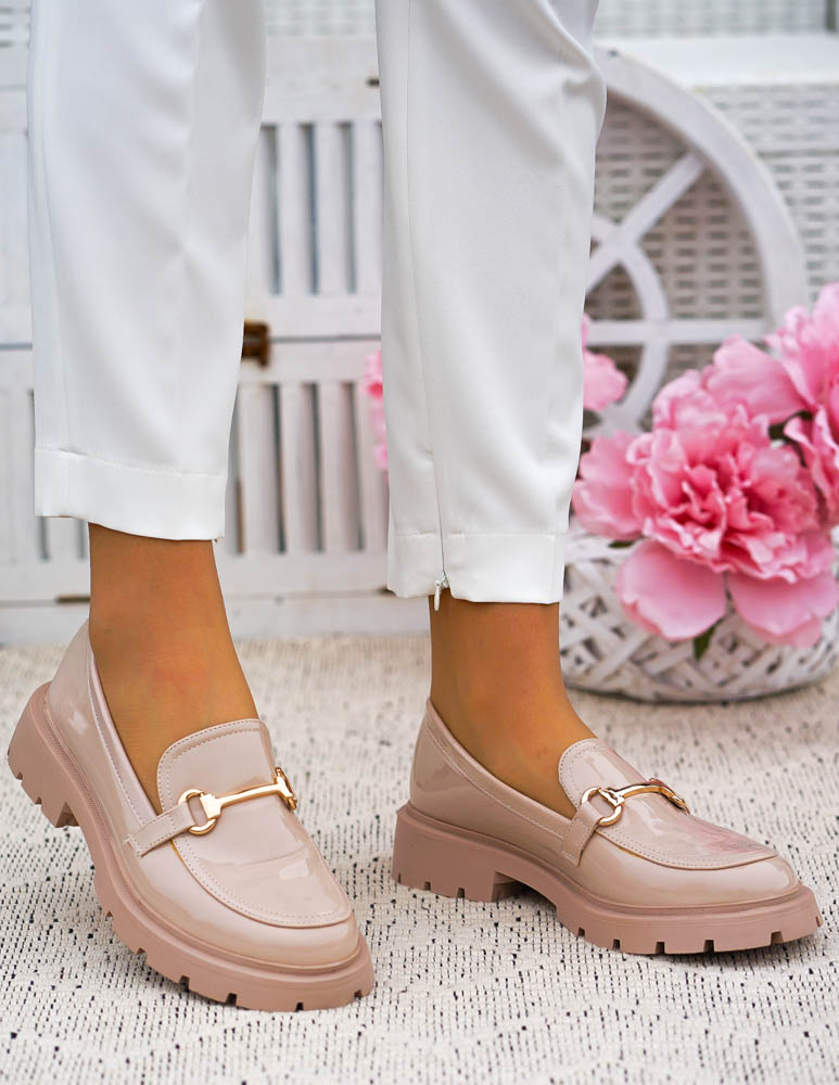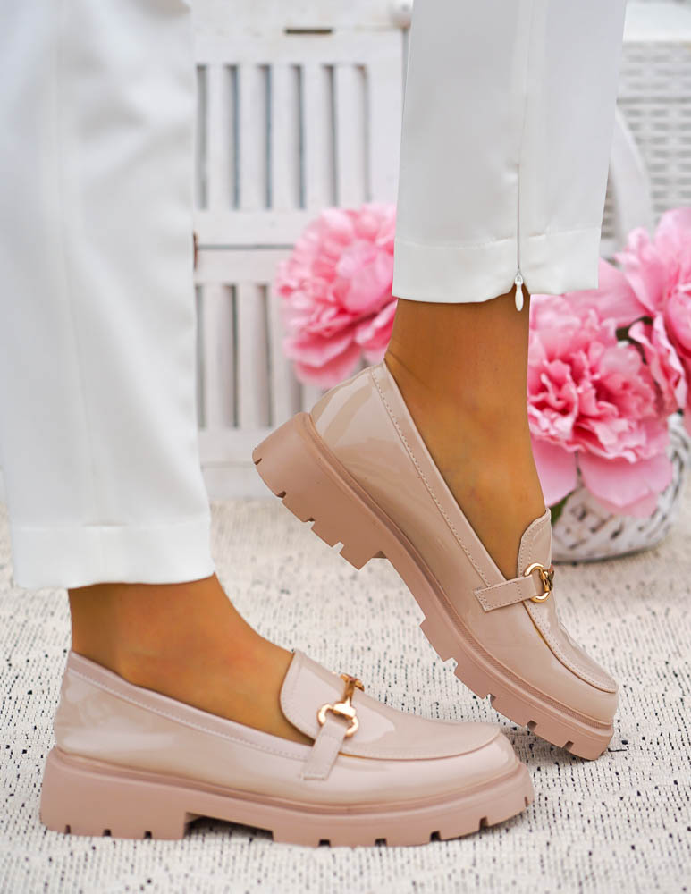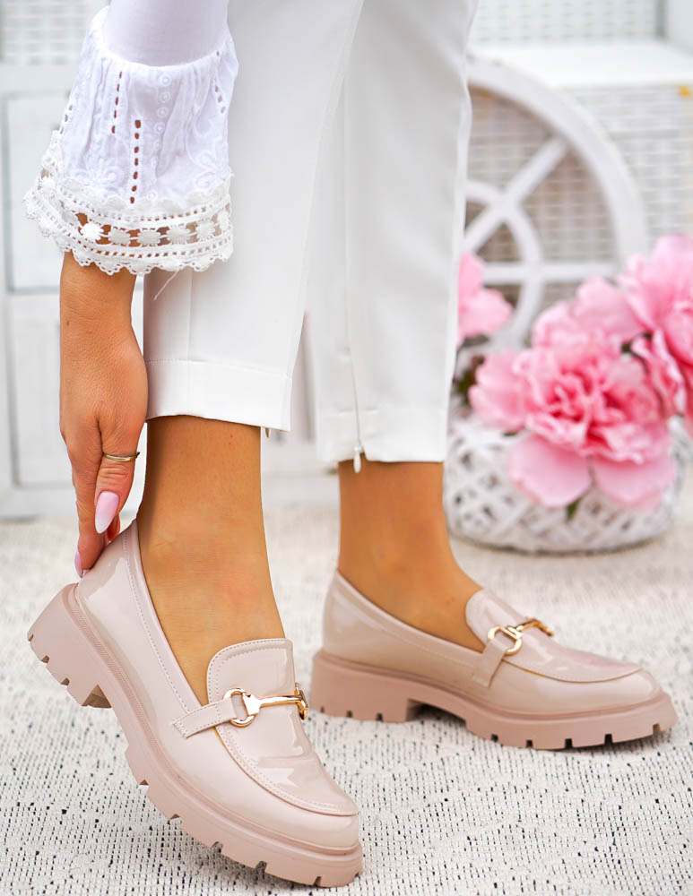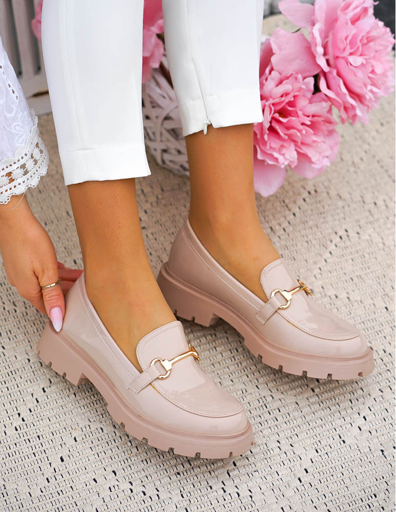 Beżowe Lakierowane Mokasyny Na Grubej Podeszwie