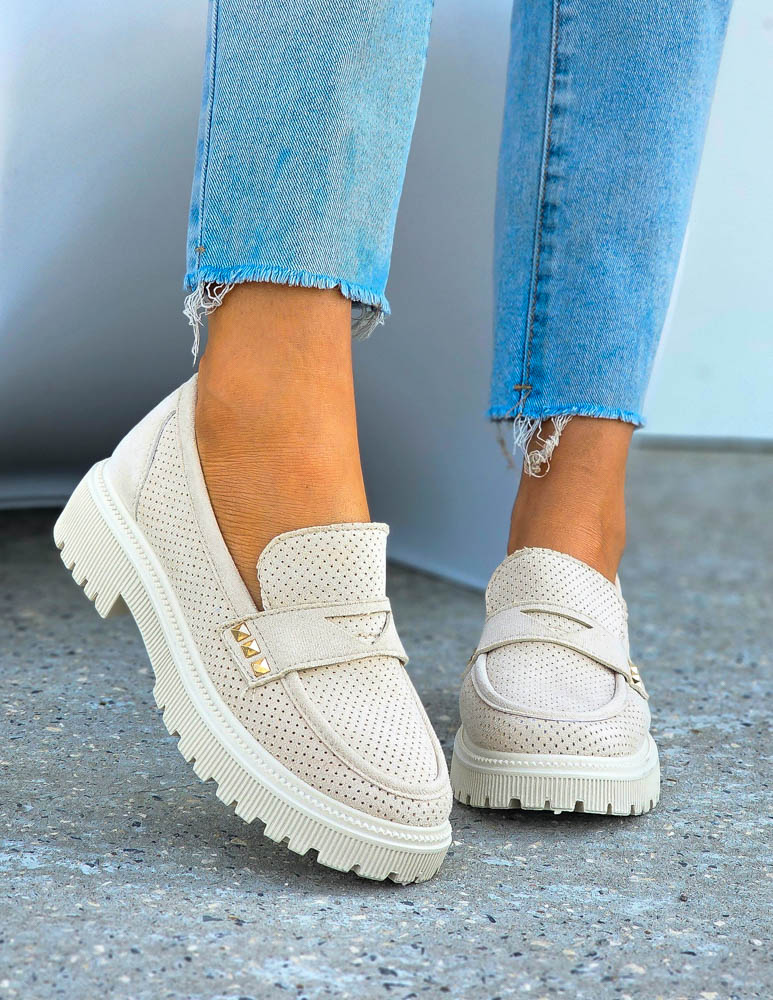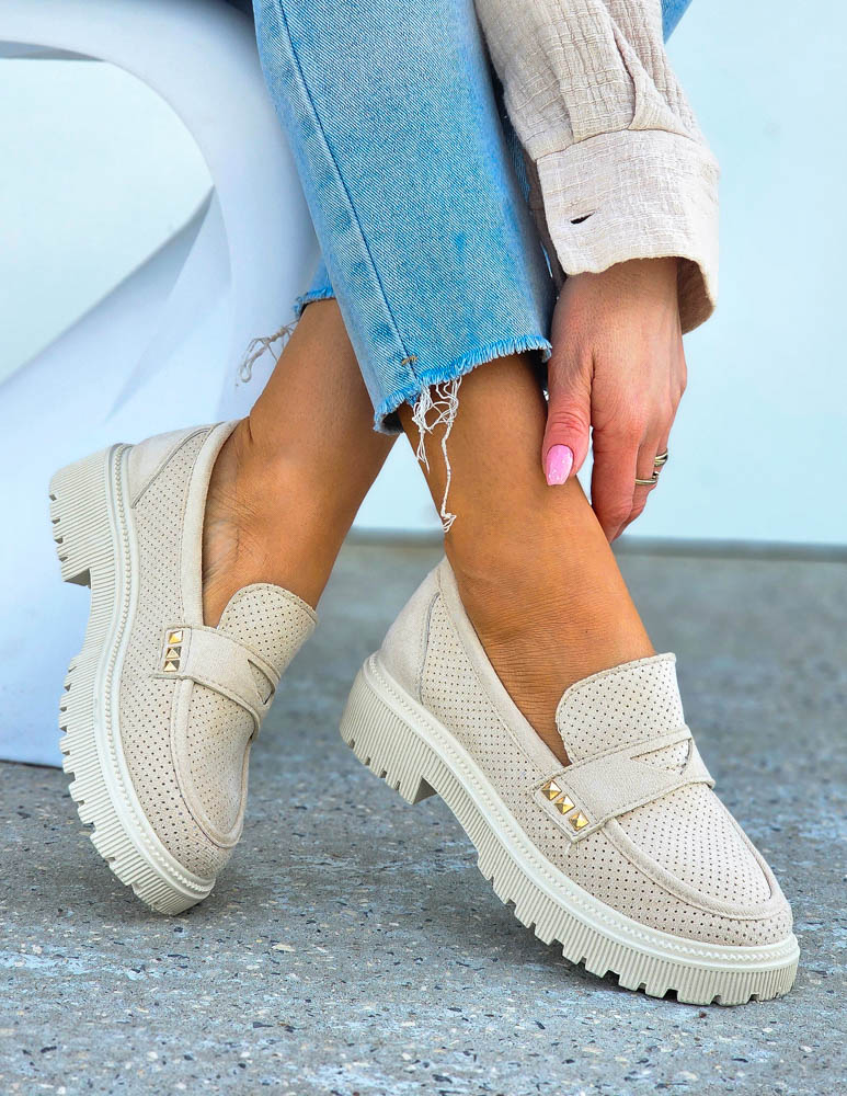 ❤ Efektowne, beżowe mokasyny w ażurowy print