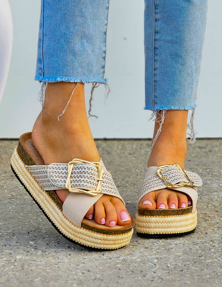 Beżowe Strukturalne Klapki Na Platformie Sally