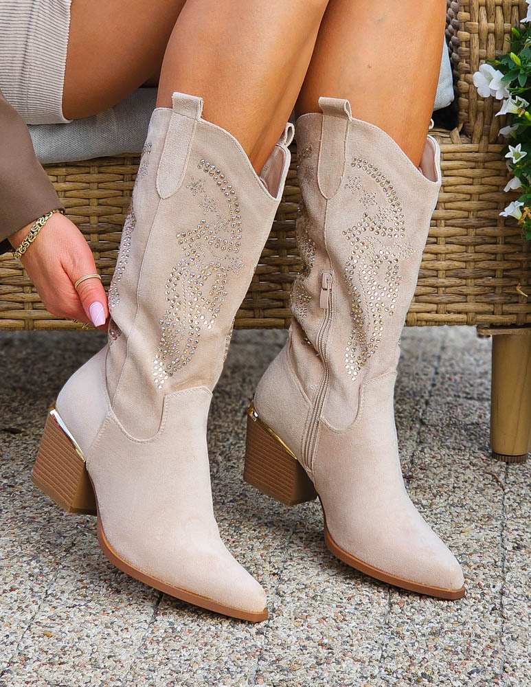 Beżowe Zamszowe Botki Kowbojki Kozaki Diamonds