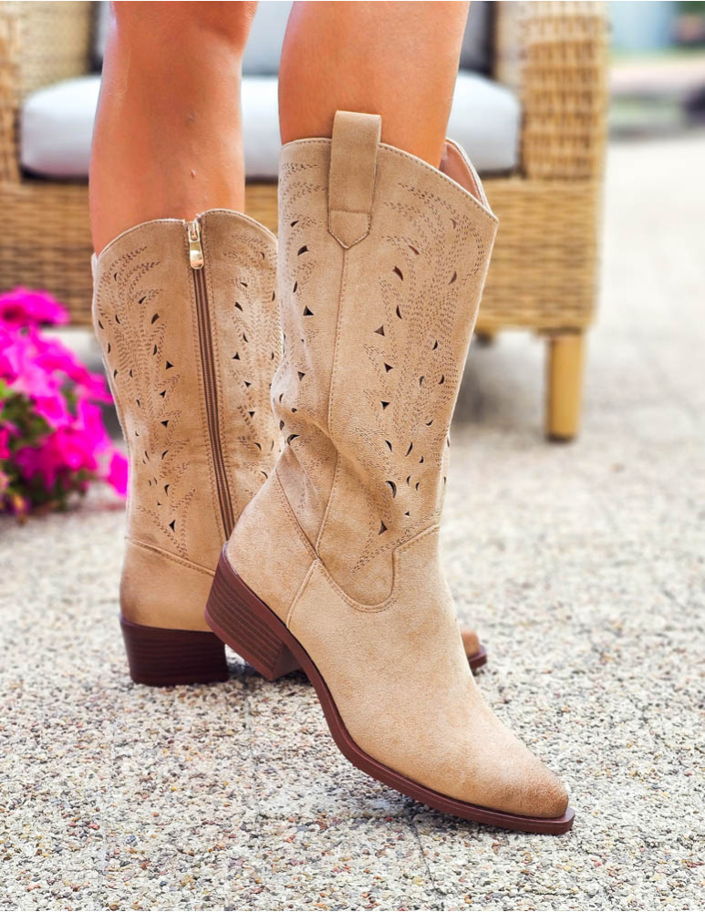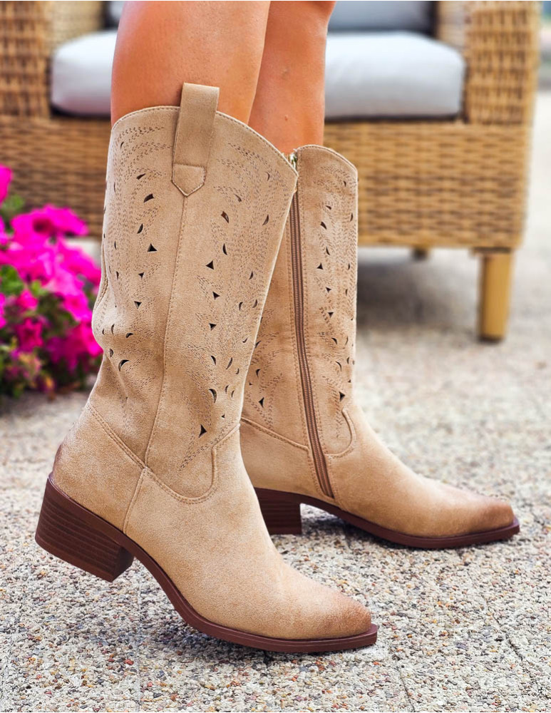 Beżowe Zamszowe Kozaki Kowbojki Ażurowe Hellen