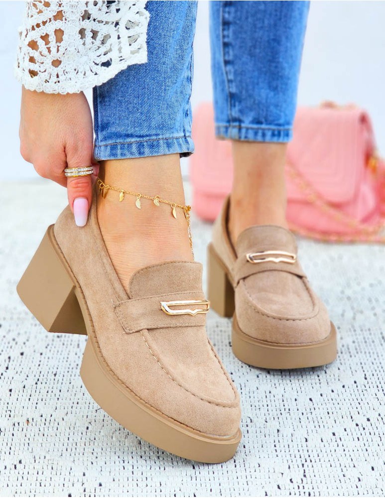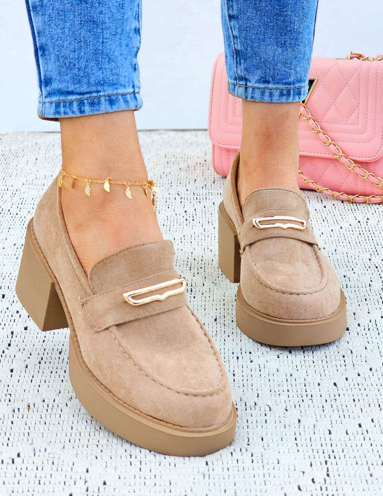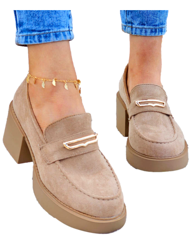 Beżowe Zamszowe Półbuty Mokasyny Na Klocku Sante