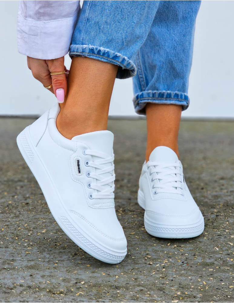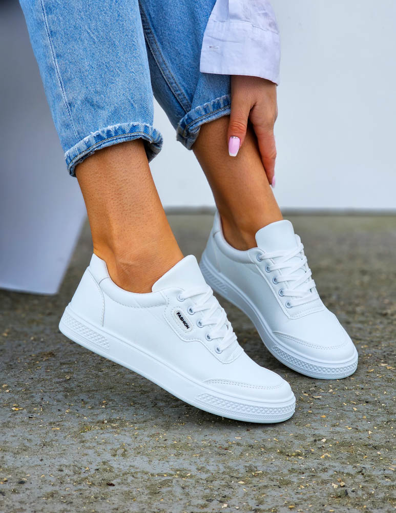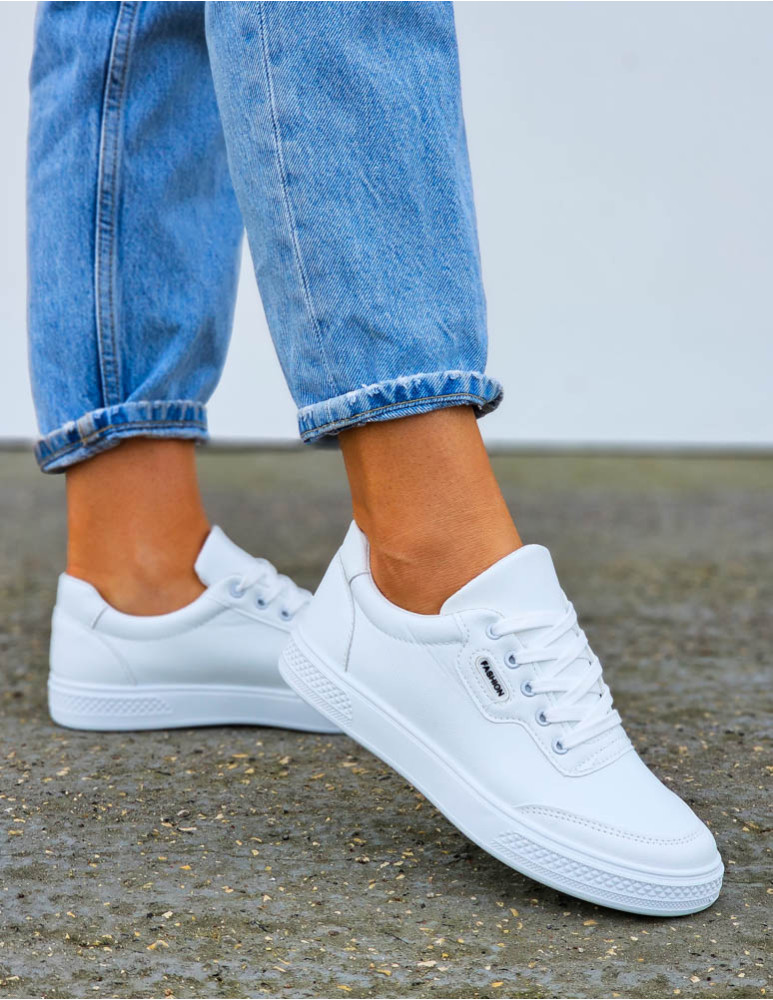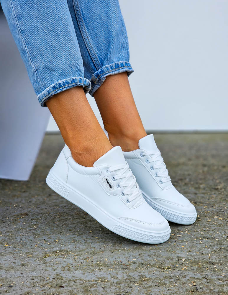 - Białe trampki w całości wykonane z mięciutkiej eco skórki. Lekkie i wygodne. Klasyczny fason wpisze się w każdy styl.