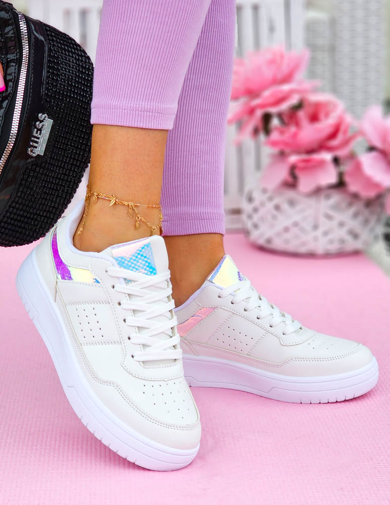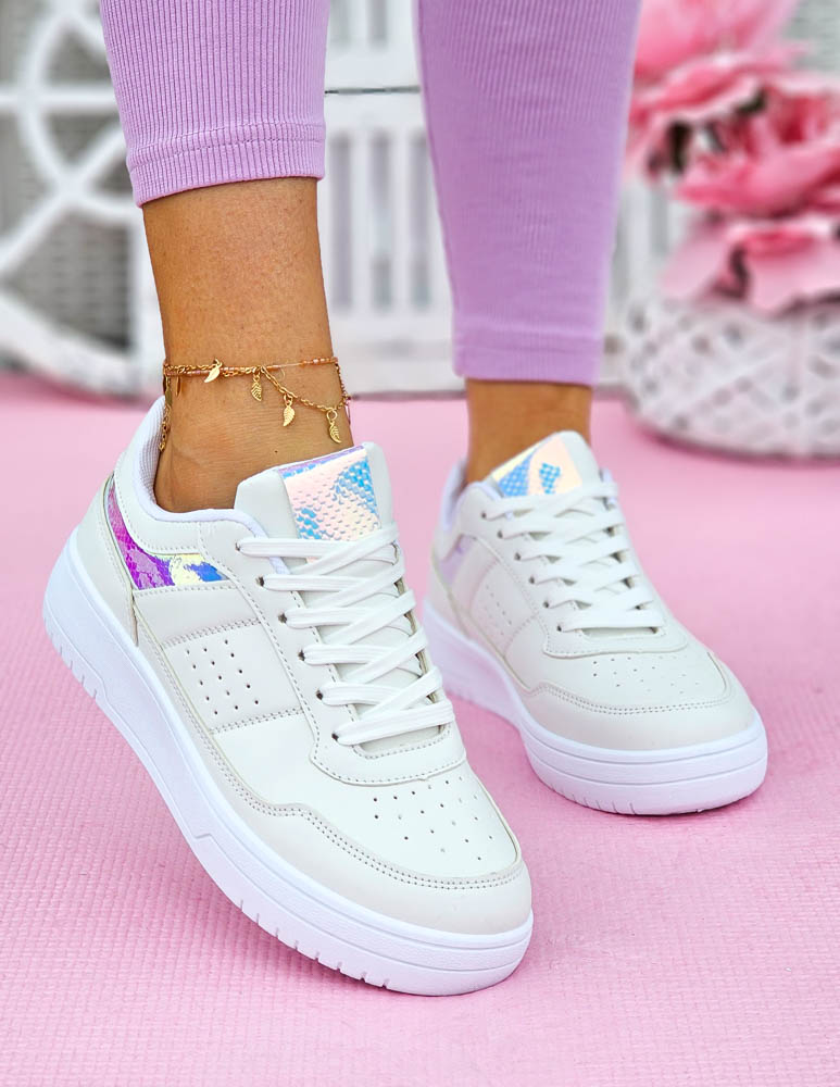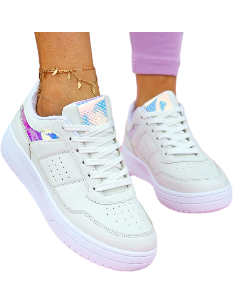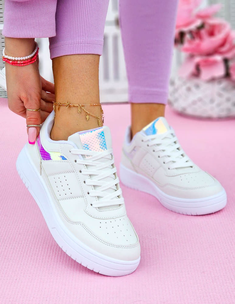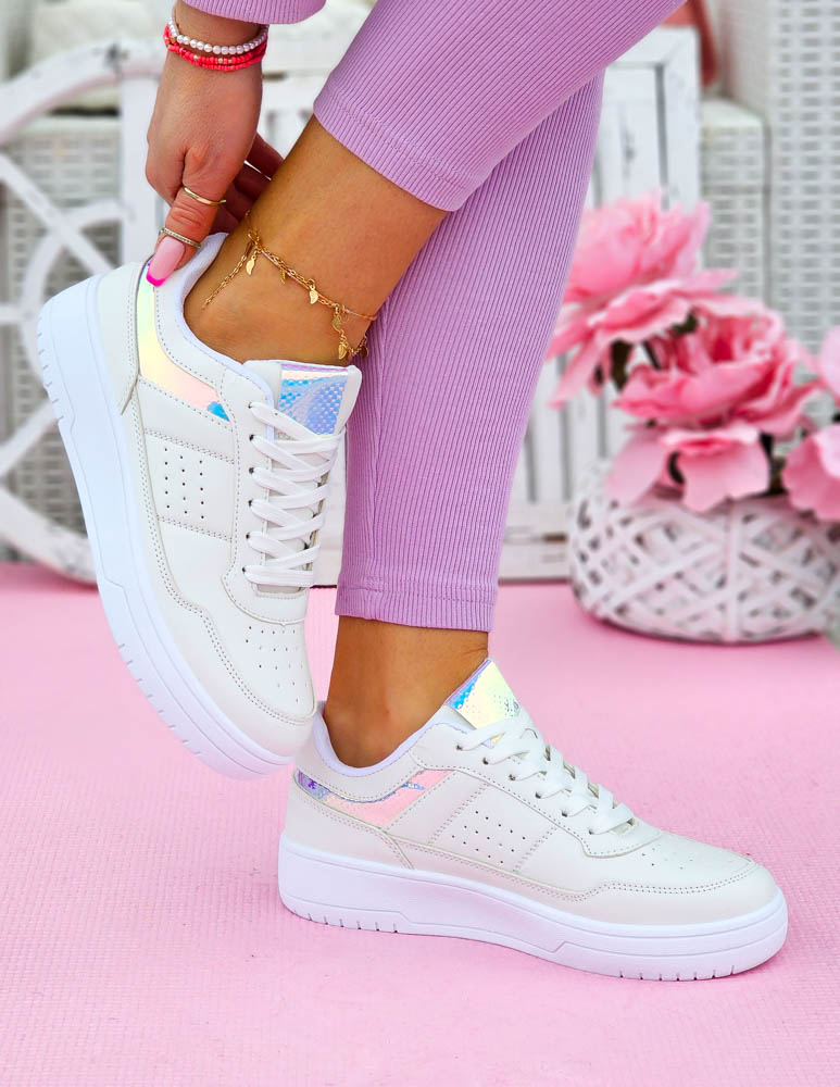 Klasyczne, białe adidasy ze skóry ekologicznej. Buty posiadają grubą podeszwę oraz subtelne, holograficzne wstawki.