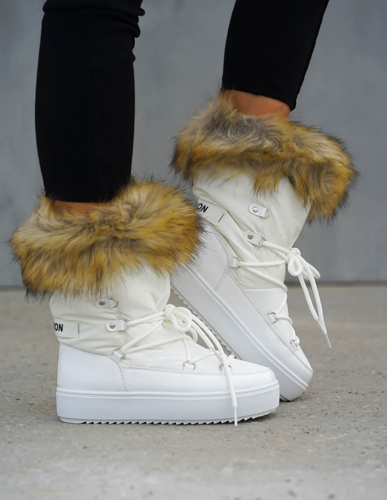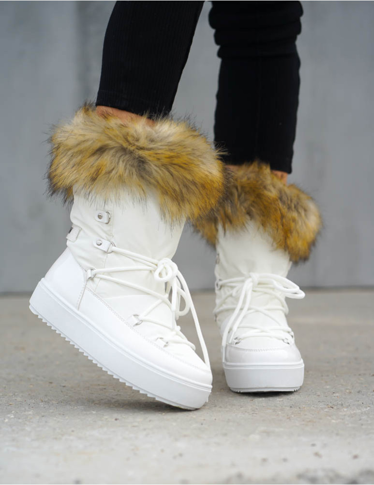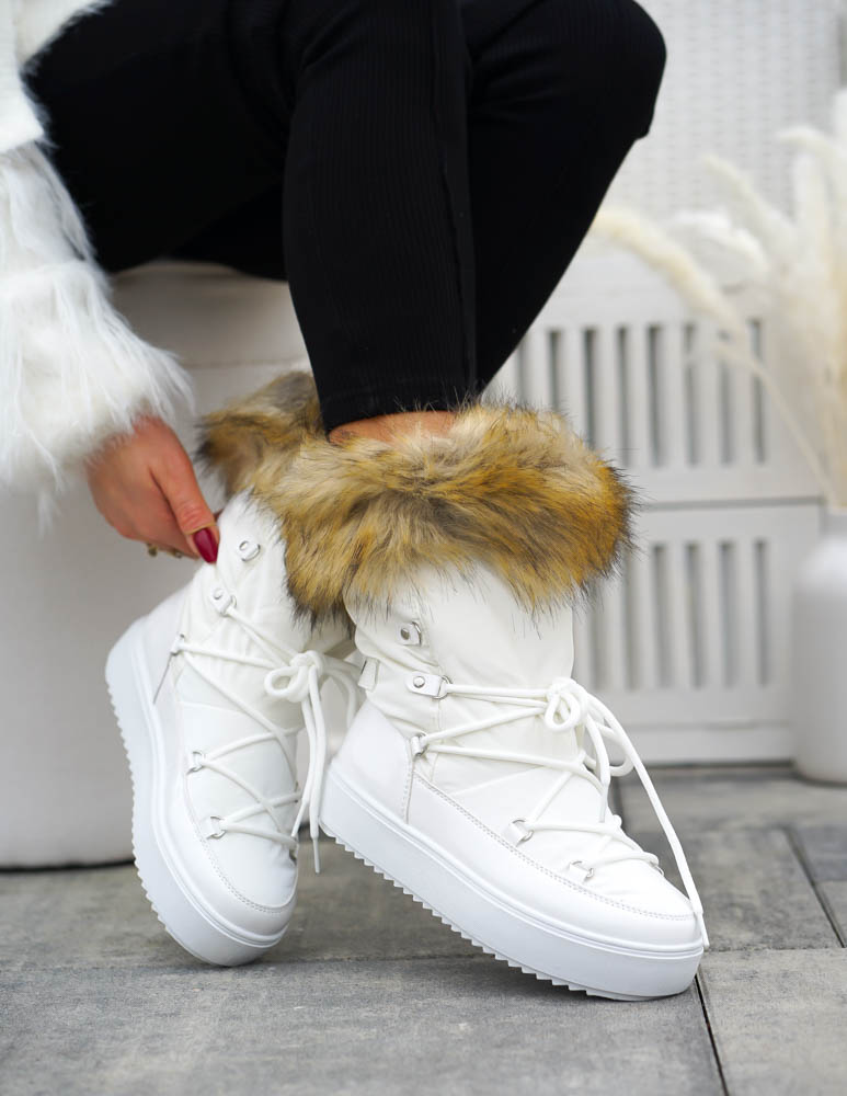 Białe, bardzo ciepłe śniegowce damskie na zimę. Buty wykonane są z nieprzemakalnej, śliskiej eco skóry . Ocieplane grubym, miłym futerkiem. Gruba, antypoślizgowa podeszwa zapewni komfort użytkowania.Śniegowce są sznurowane.Lekkie, ultra kobiece botki, które świetnie sprawdzą się w zimowe, mroźne i śnieżne dni.