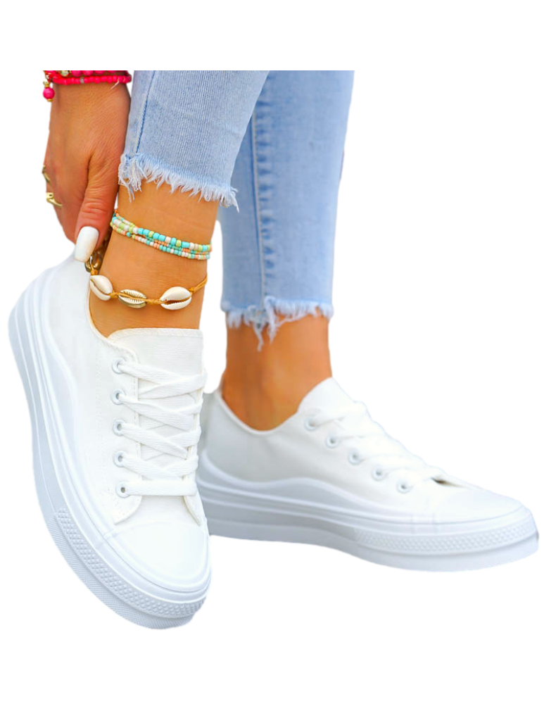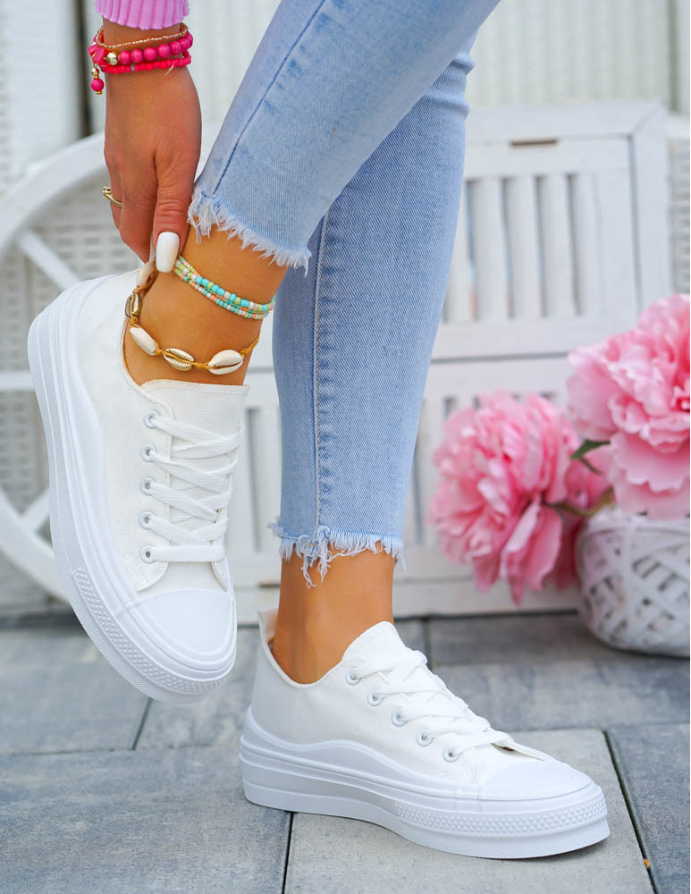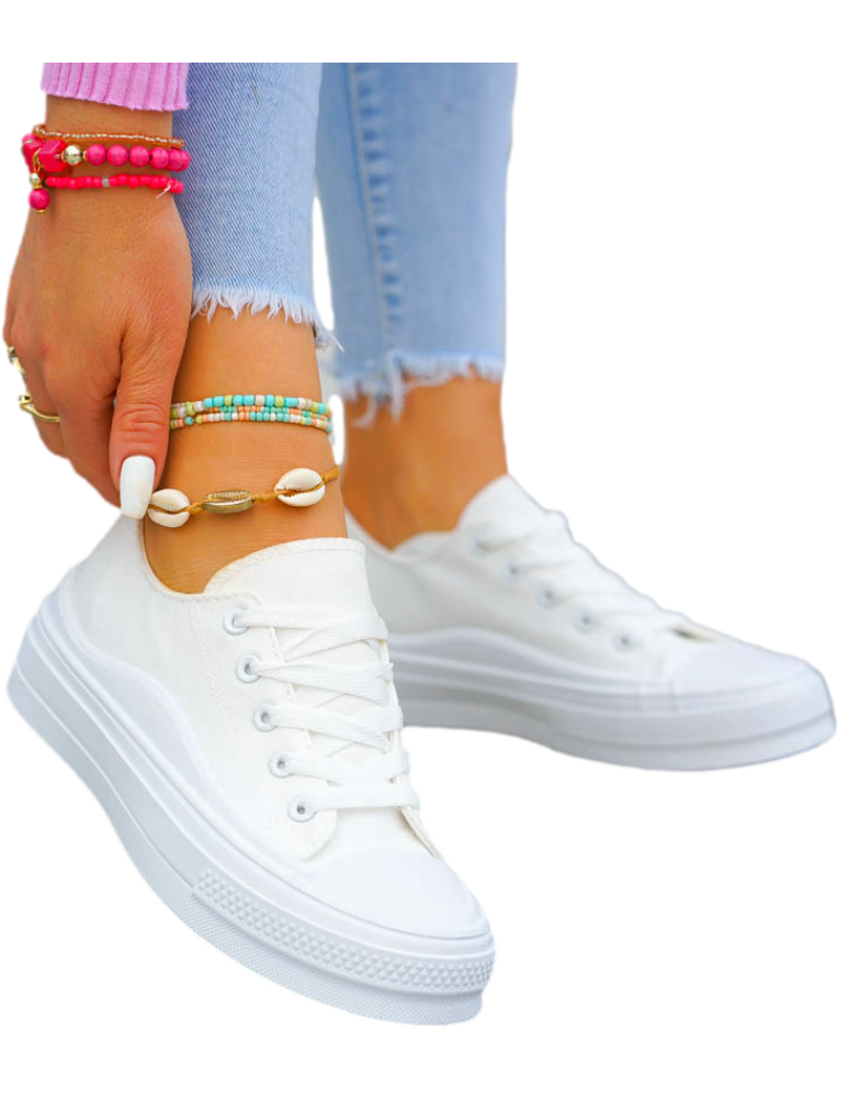 - Białe trampki w całości wykonane z przewiewnej tjkaniny. Lekkie i wygodne. Klasyczny fason wpisze się w każdy styl.