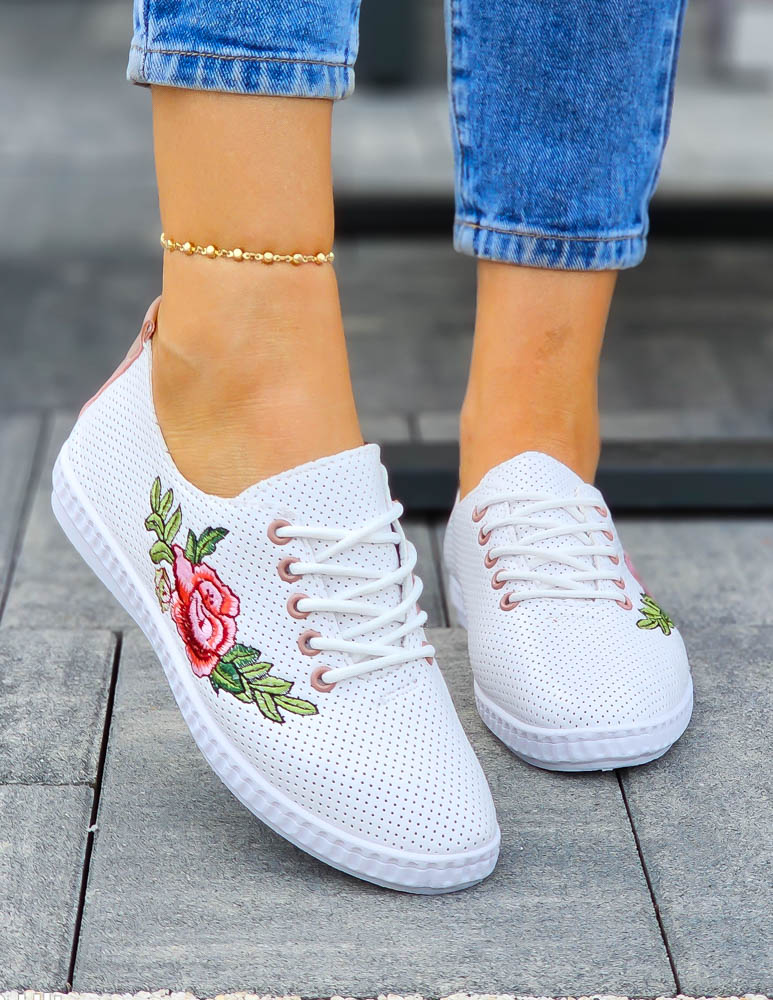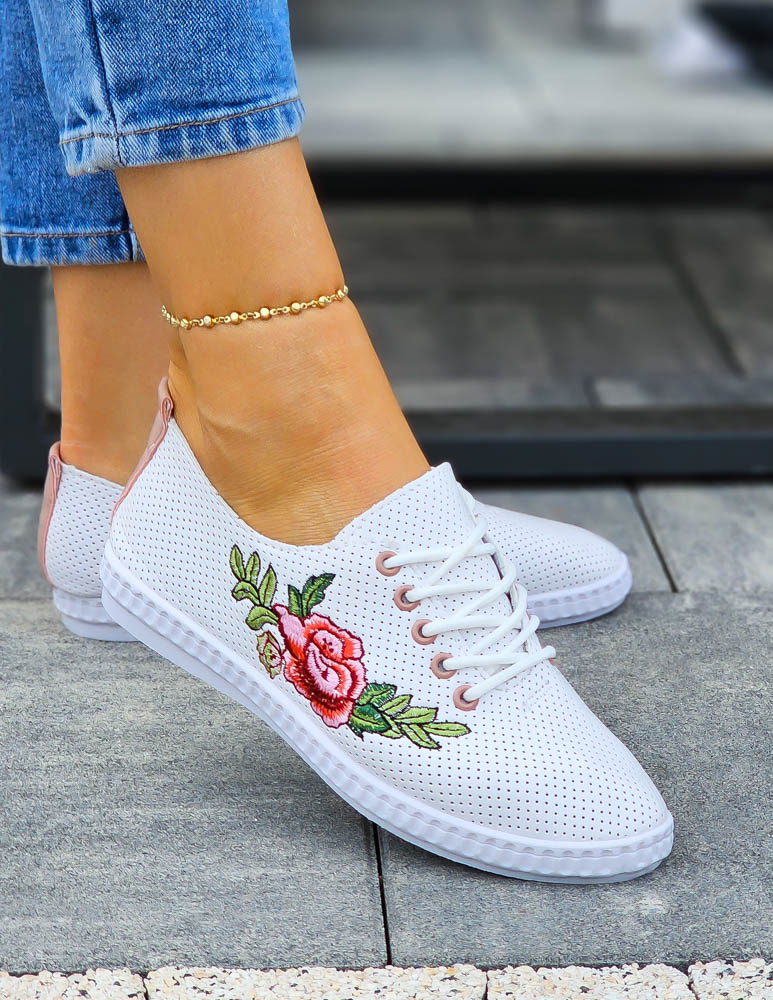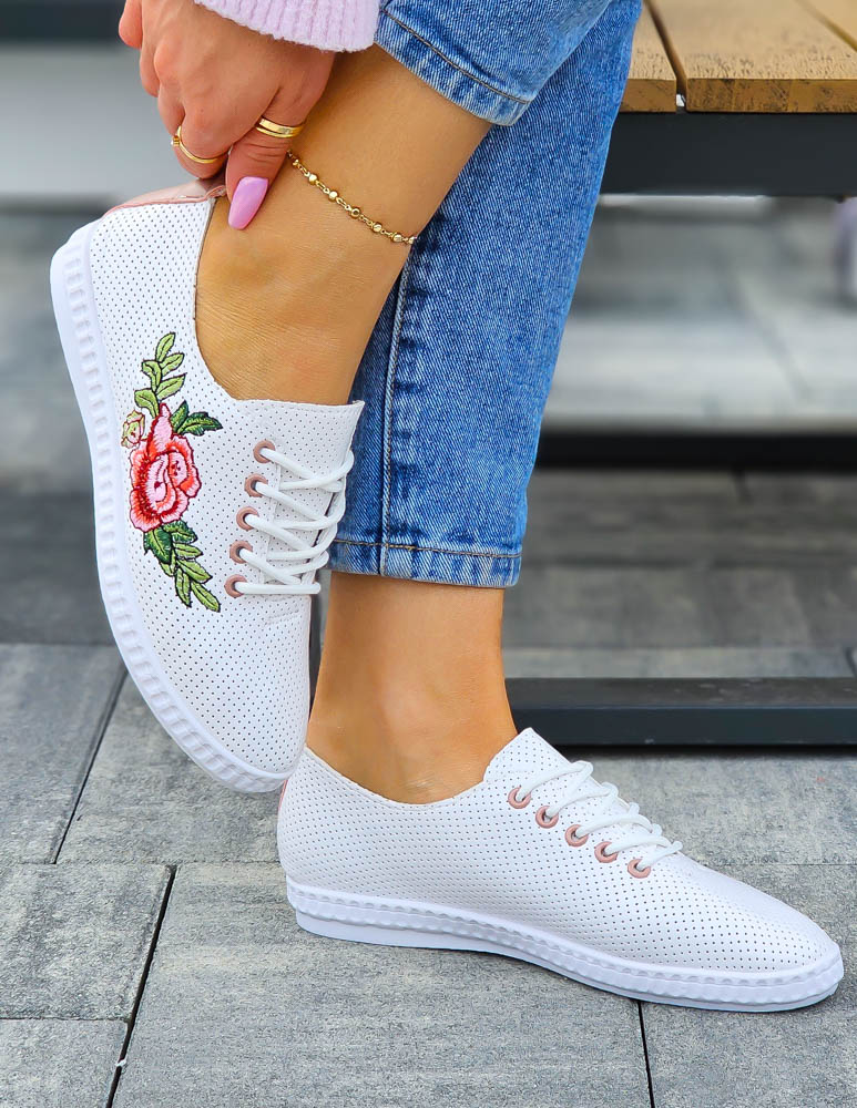❤Białe skórzane trampki z motywem kwiatowym