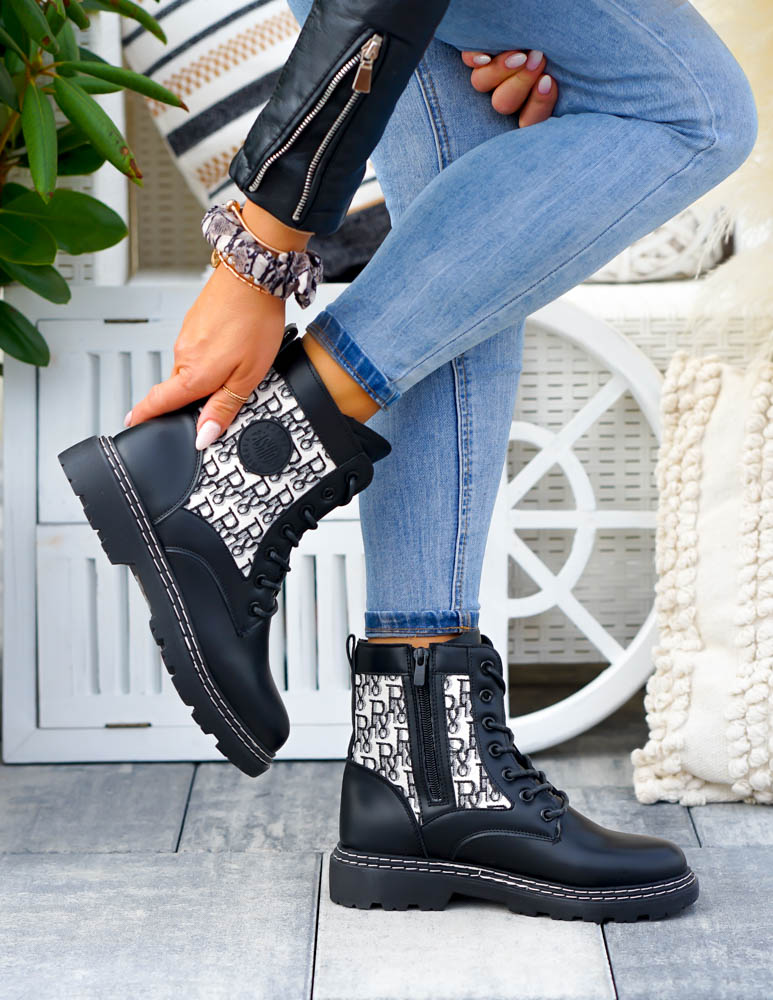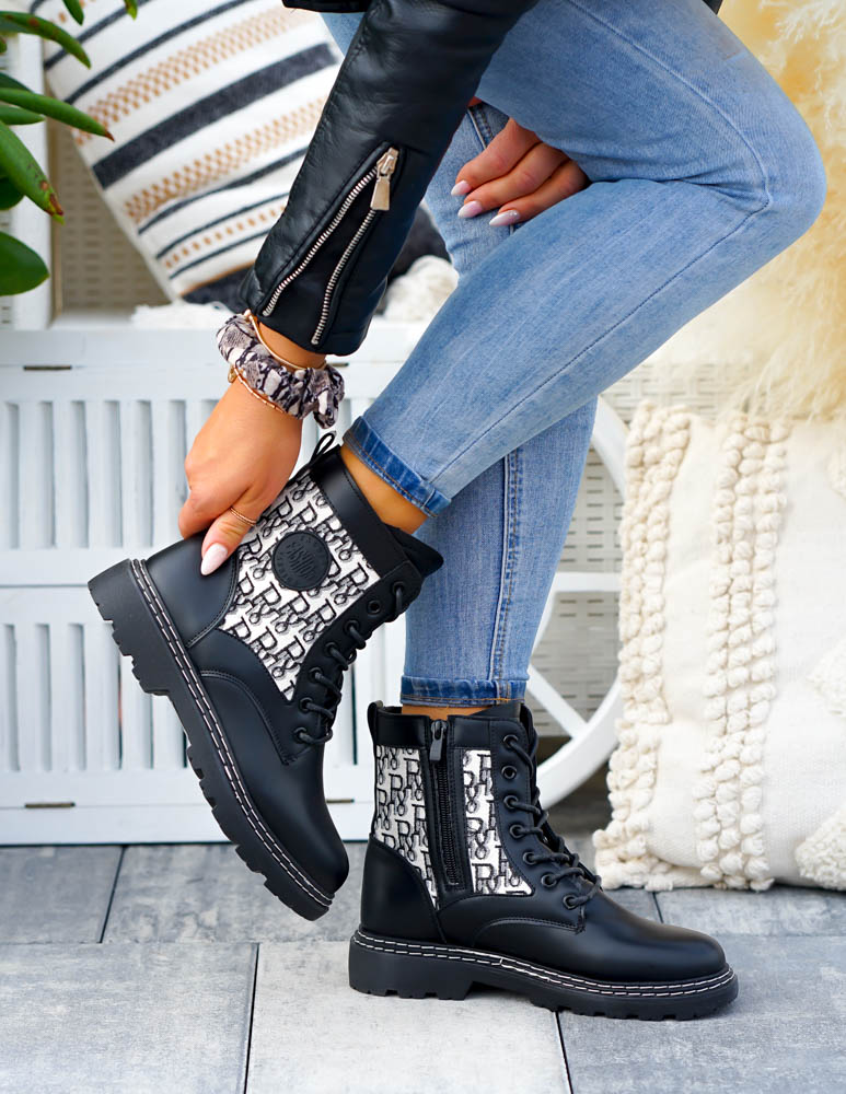 Czarne Botki Damskie Z Suwakiem Płaski Spód Military