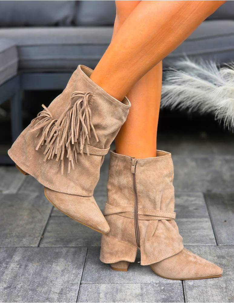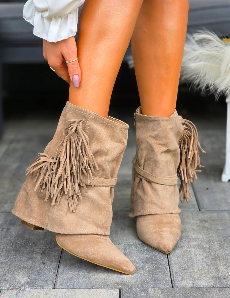 - Kod produktu: Beżowe Zamszowe Botki z Frędzelkami i Wywiniętą Cholewką