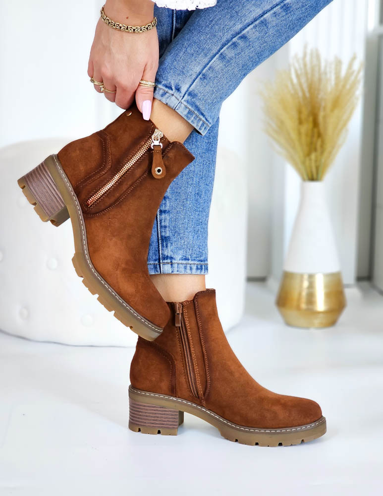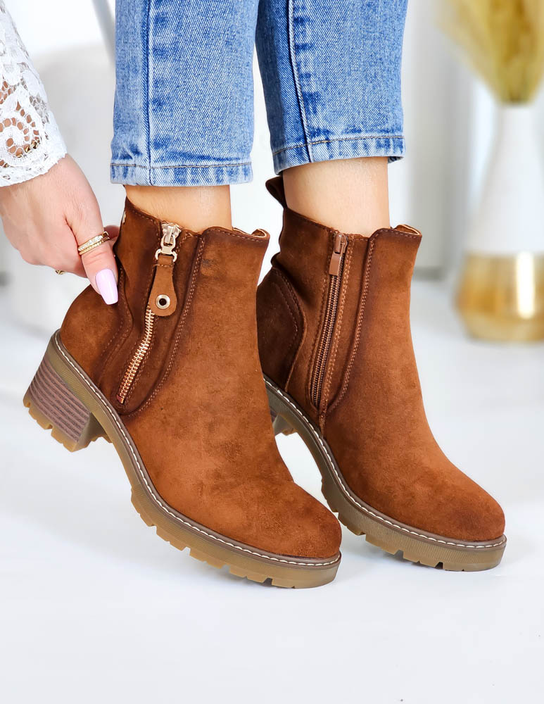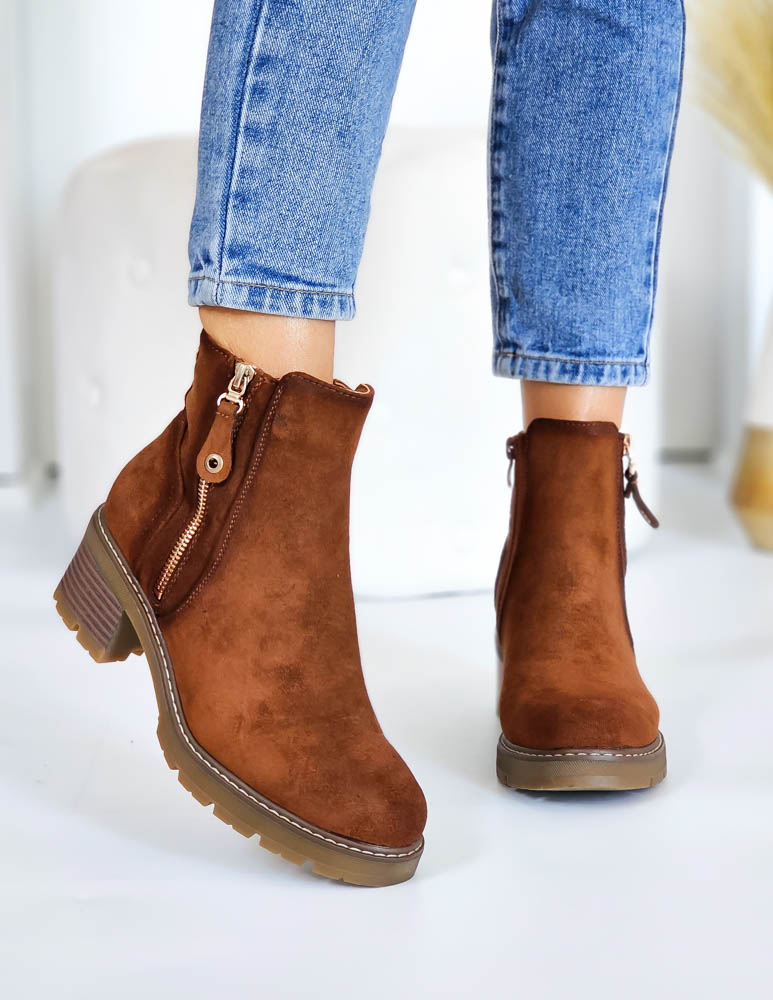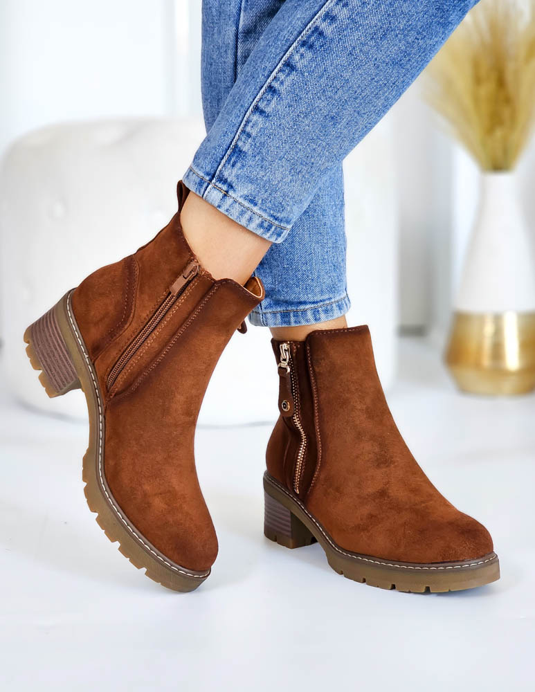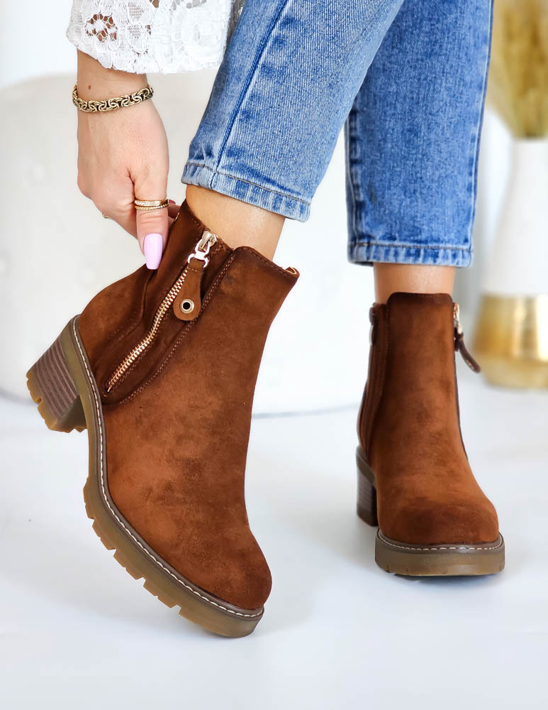 - Kod produktu: Brązowe Zamszowe Botki Na Szerokim Obcasie Melissa