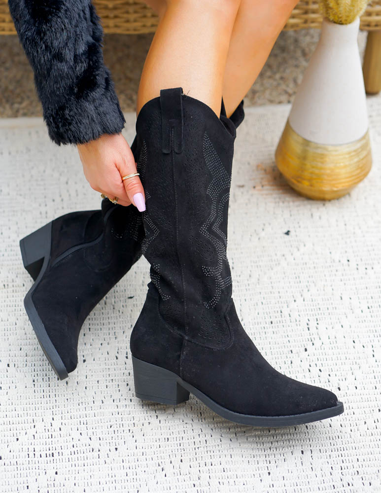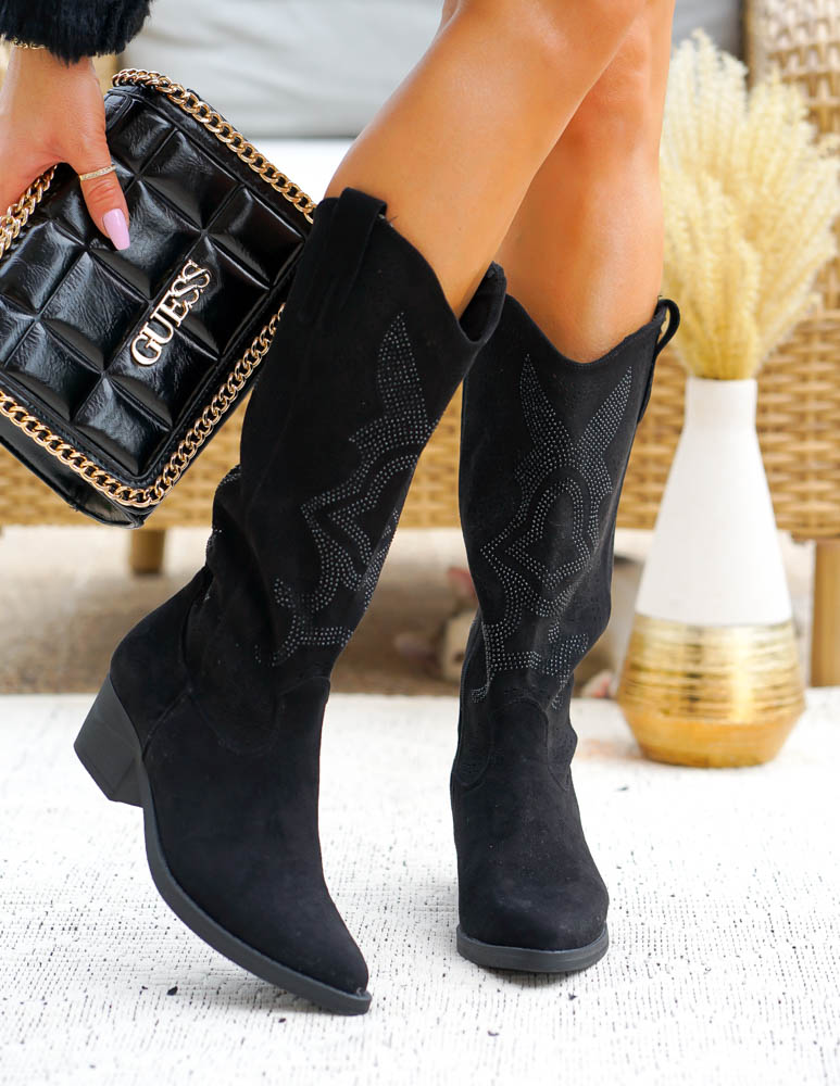 ❤ Modne i tanie buty on-line❤Klasyczne, czarne botki na niskim obcasie❤ Botki a`lla kowbojki ze..