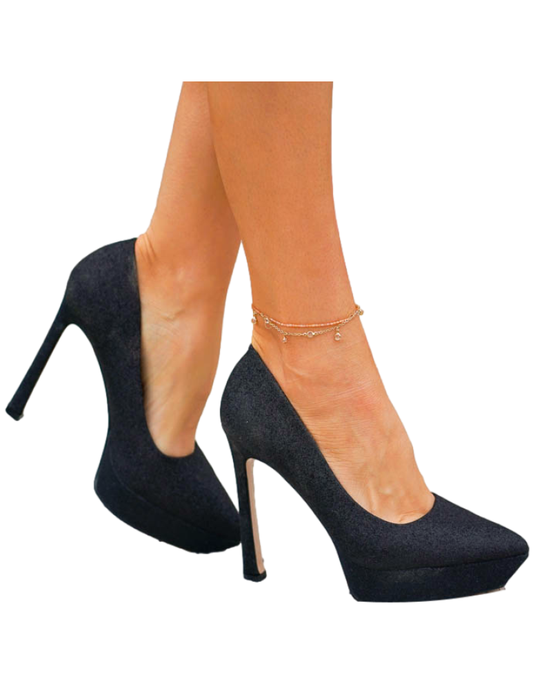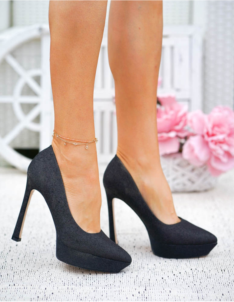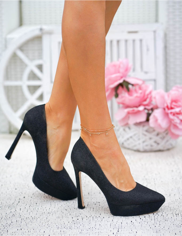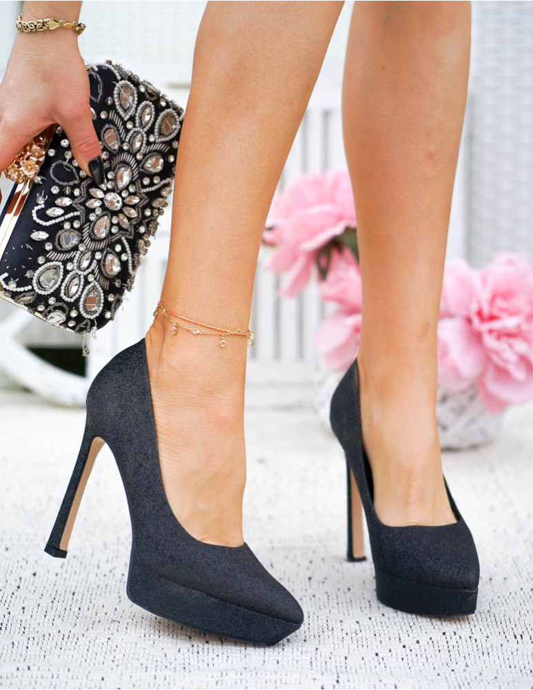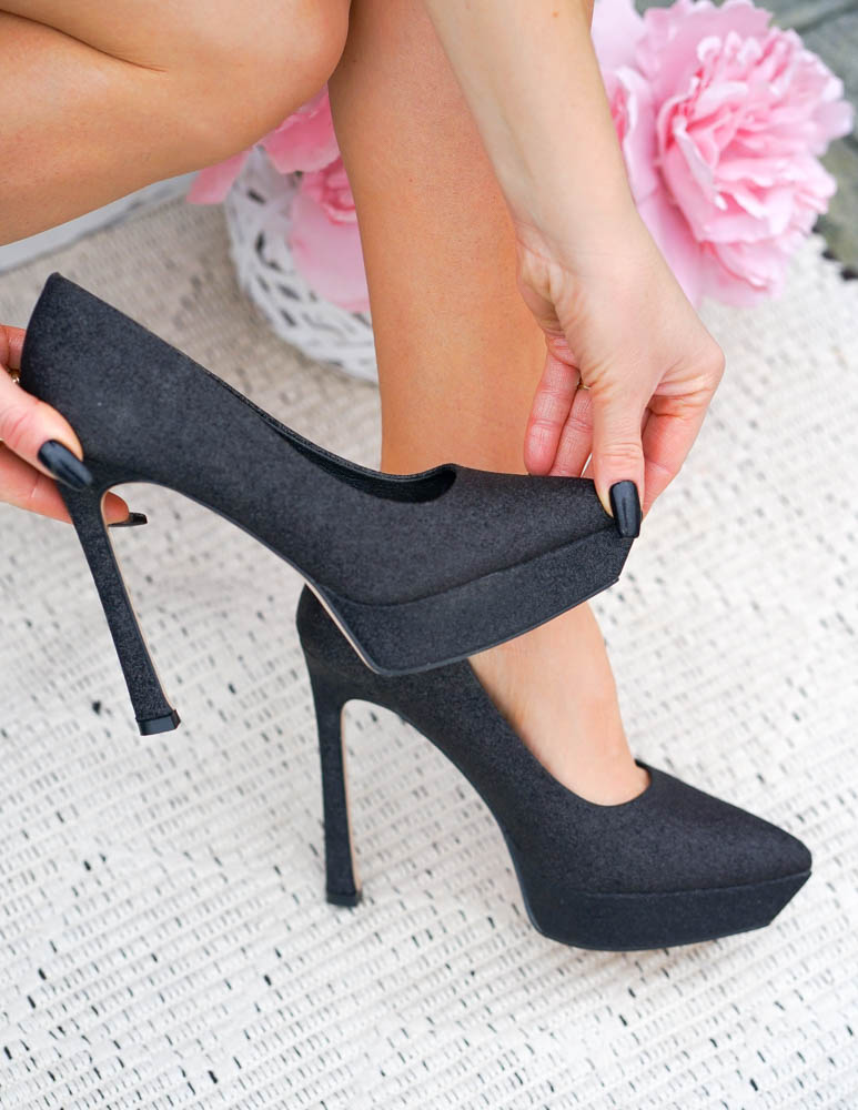 Czarne Brokatowe Czółenka Na Szpilce Dimonds