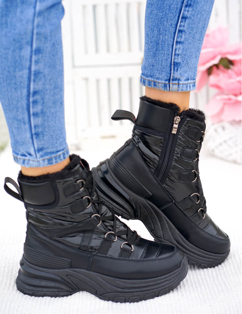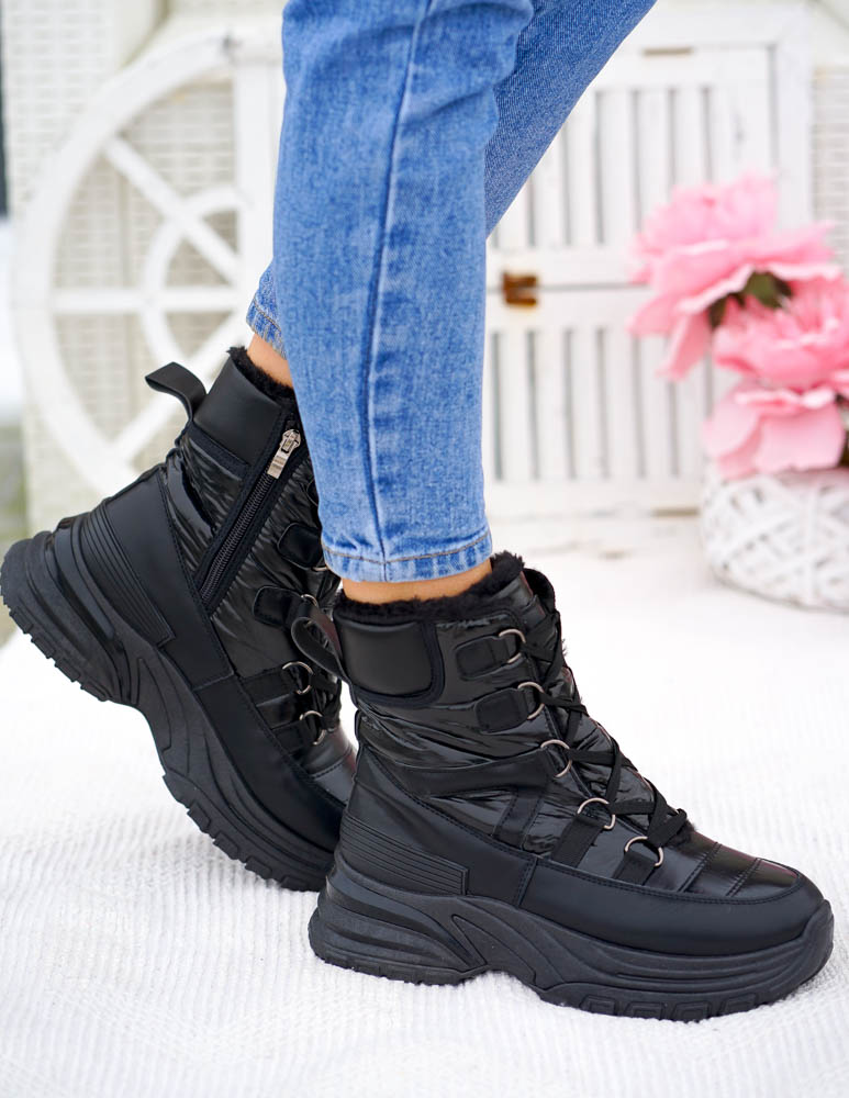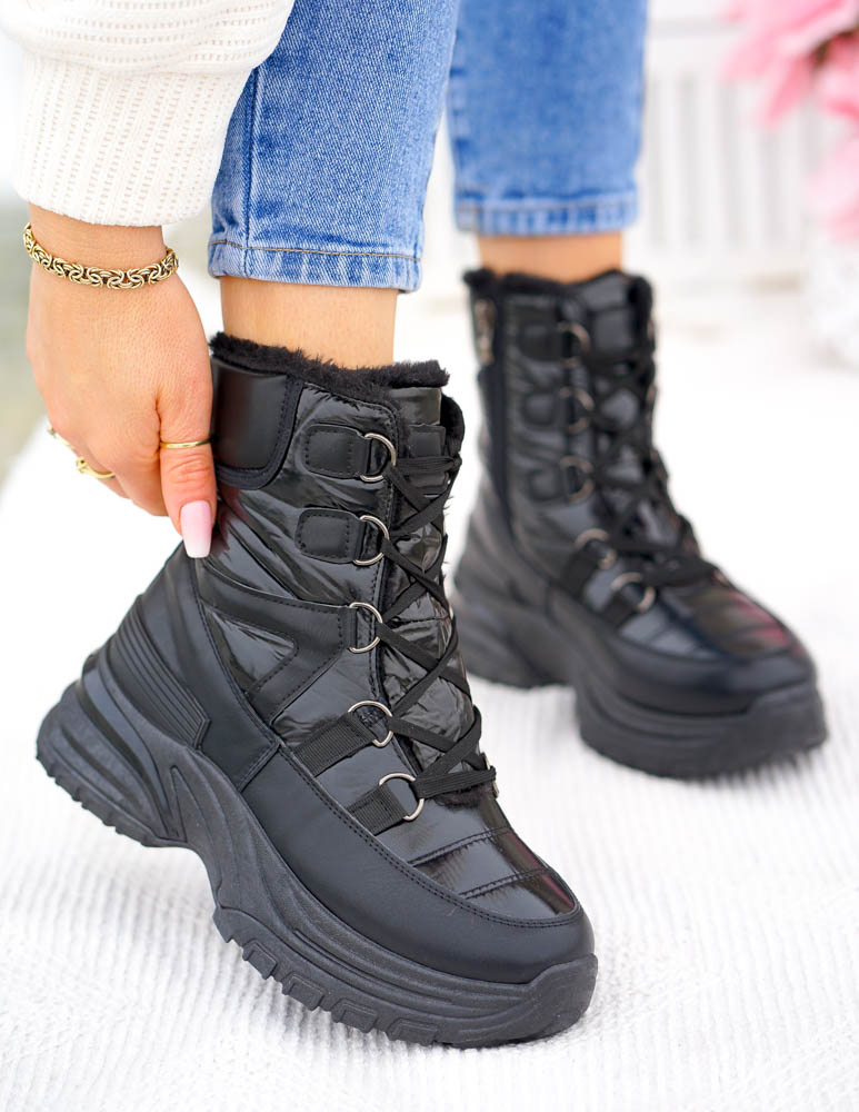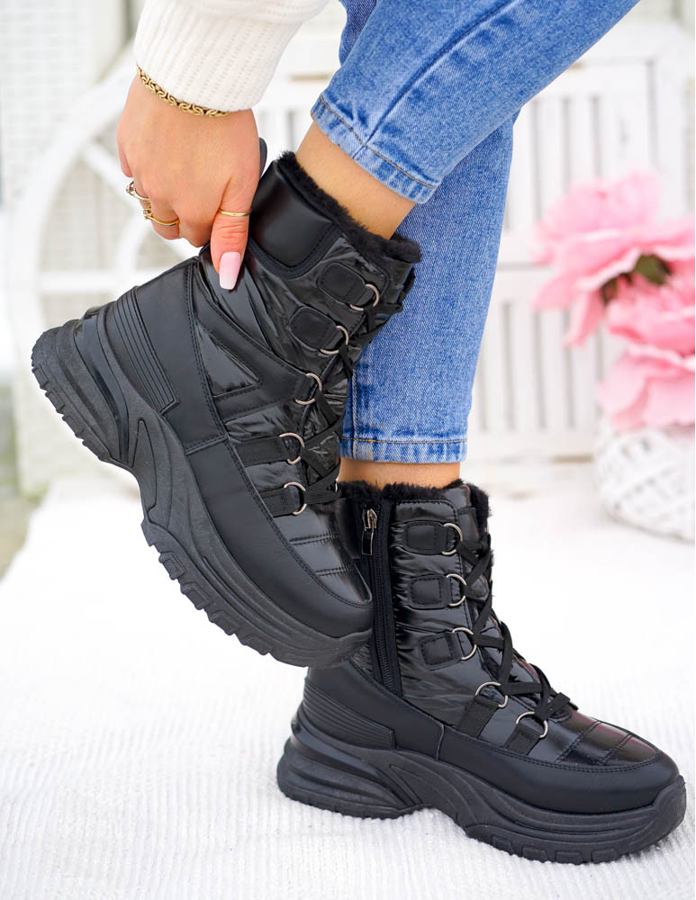 Czarne, bardzo ciepłe śniegowce damskie na zimę. Buty wykonane są z nieprzemakalnej, śliskiej eko skóry oraz tkaniny. Ocieplane grubym, miłym futerkiem. Gruba, antypoślizgowa podeszwa zapewni komfort użytkowania.Śniegowce są sznurowane posiadają także suwakLekkie, ultra kobiece botki, które świetnie sprawdzą się w zimowe, mroźne i śnieżne dni.