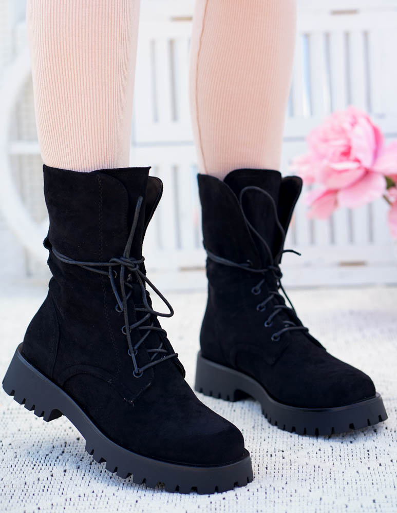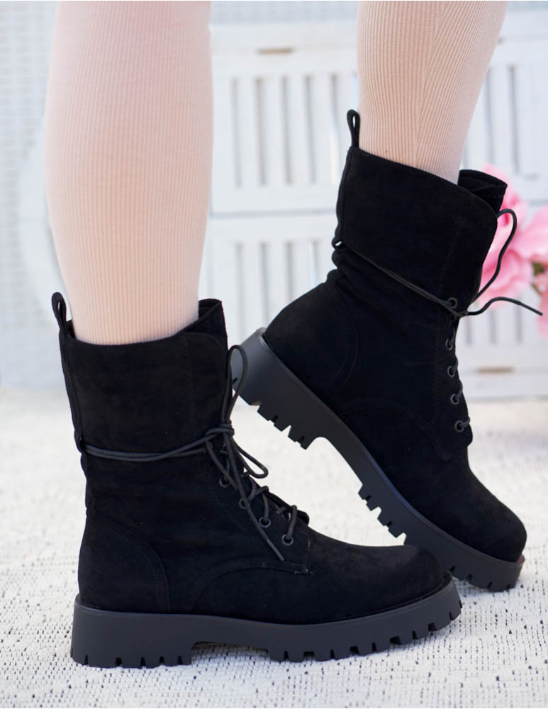 Czarne Glany Botki Zamszowe Sznurowane