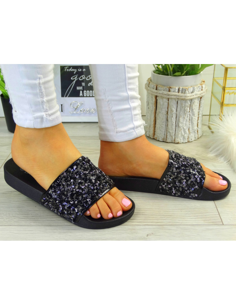 Czarne Klapki Damskie Na Lato Z Kryształkami