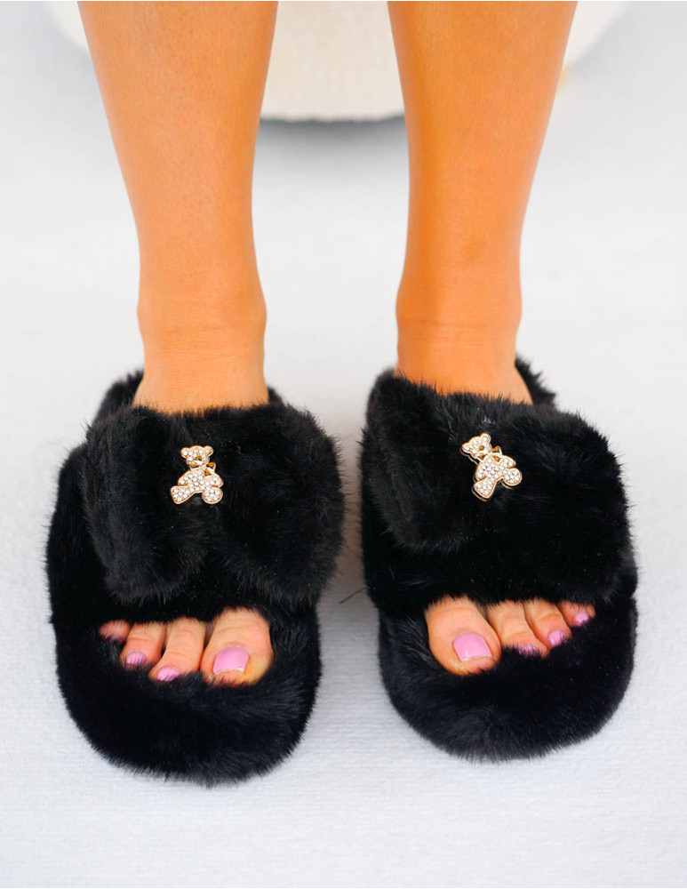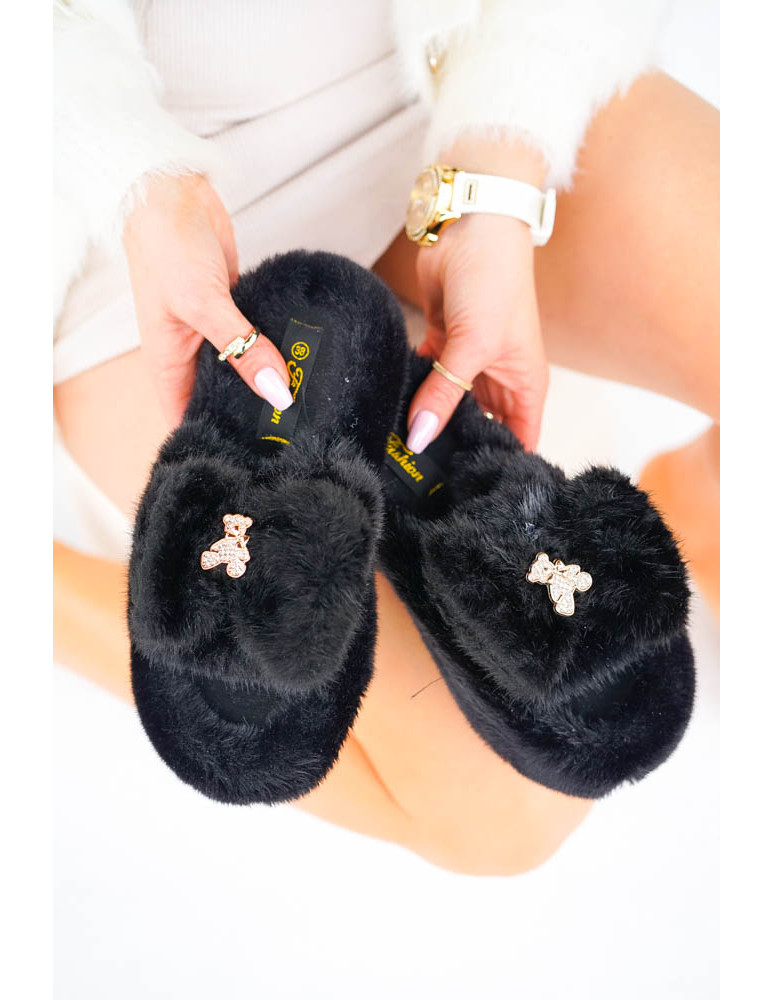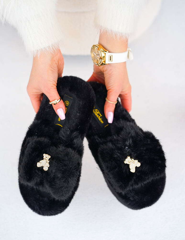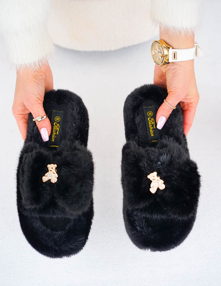 Czarne Klapki Kapcie Po Domu z Futerkiem Gold Bear