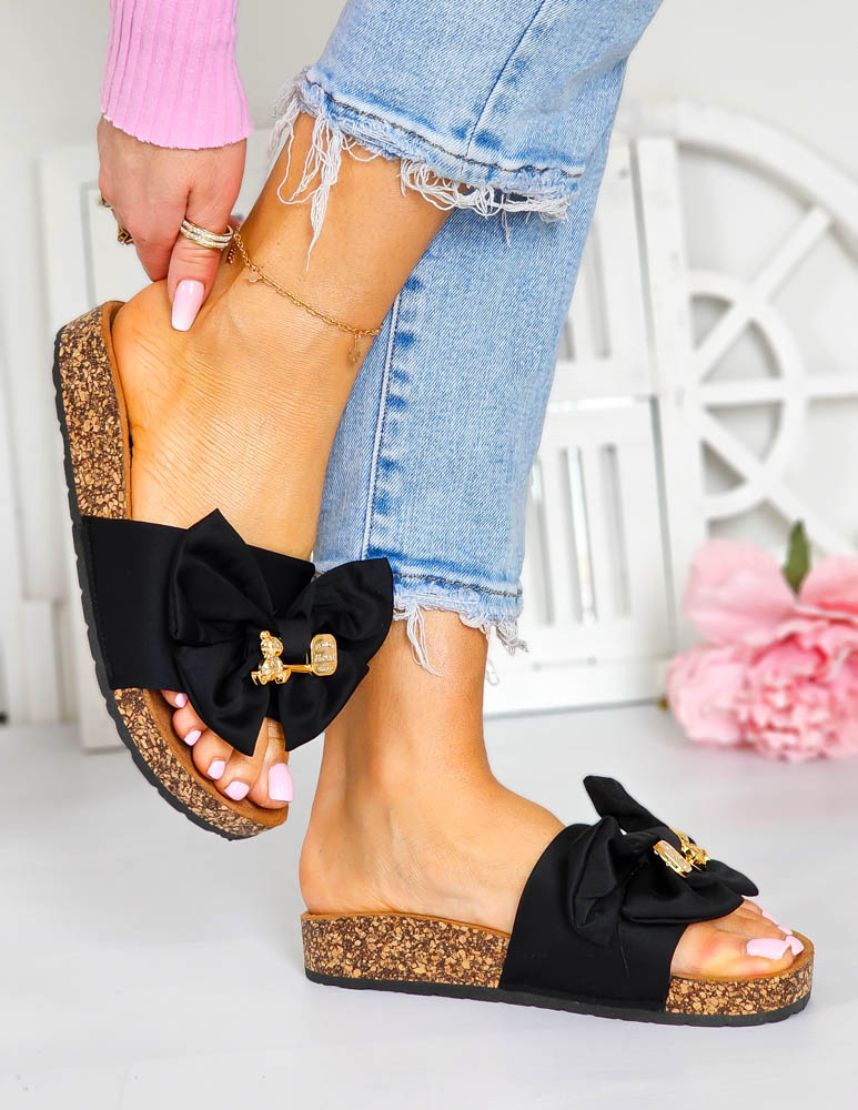 Czarne Klapki Na Grubej Korkowej Podeszwie Z Kokardą