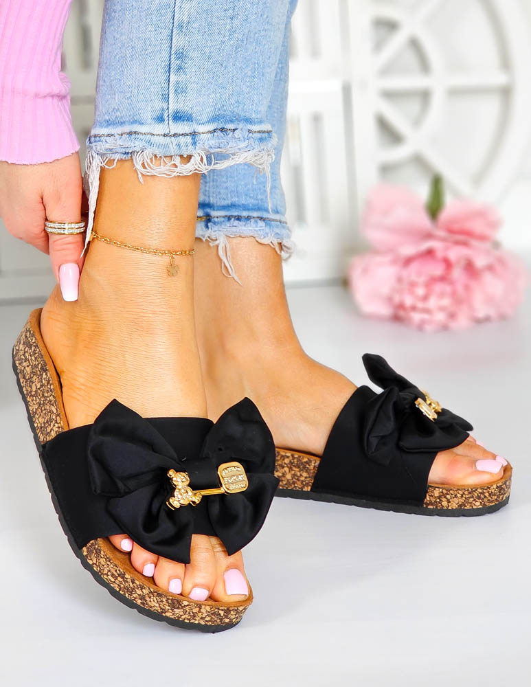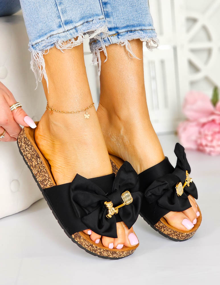 Czarne Klapki z Kokardą i Misiem Milano