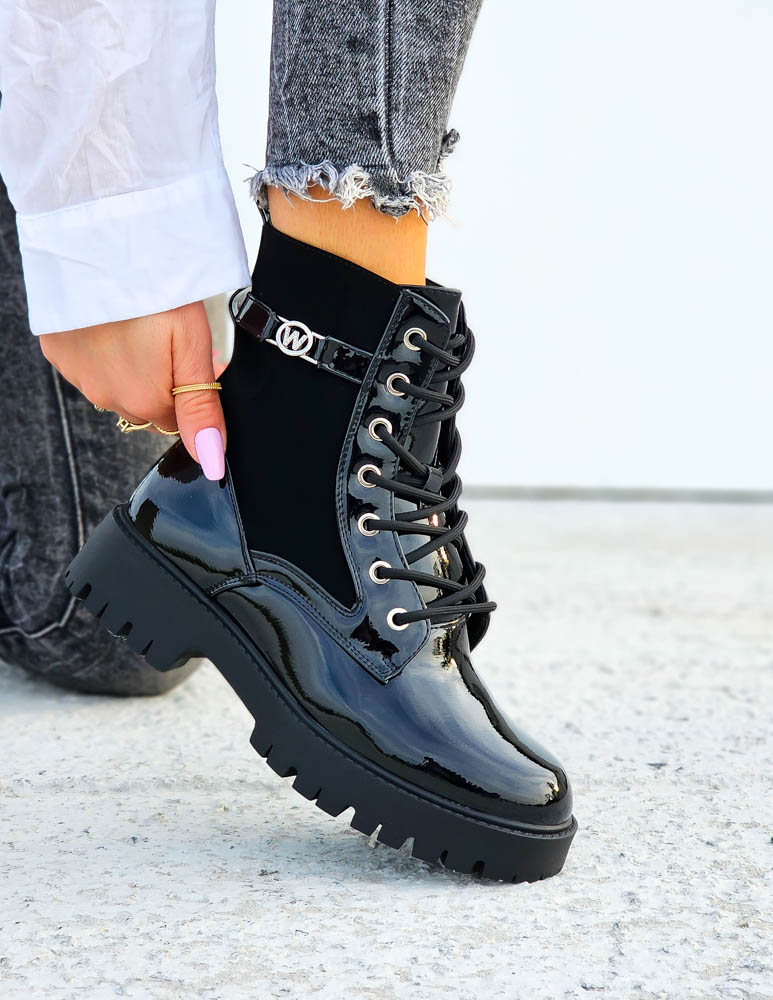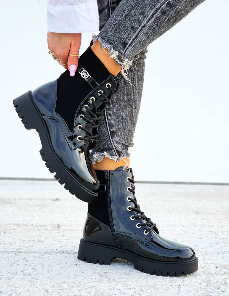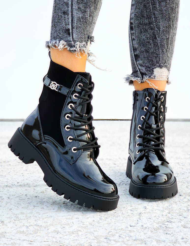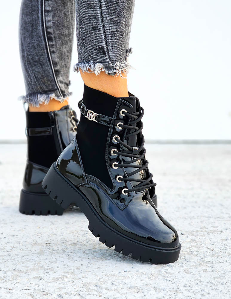 Czarne Lakierowane Botki Workery Warrior