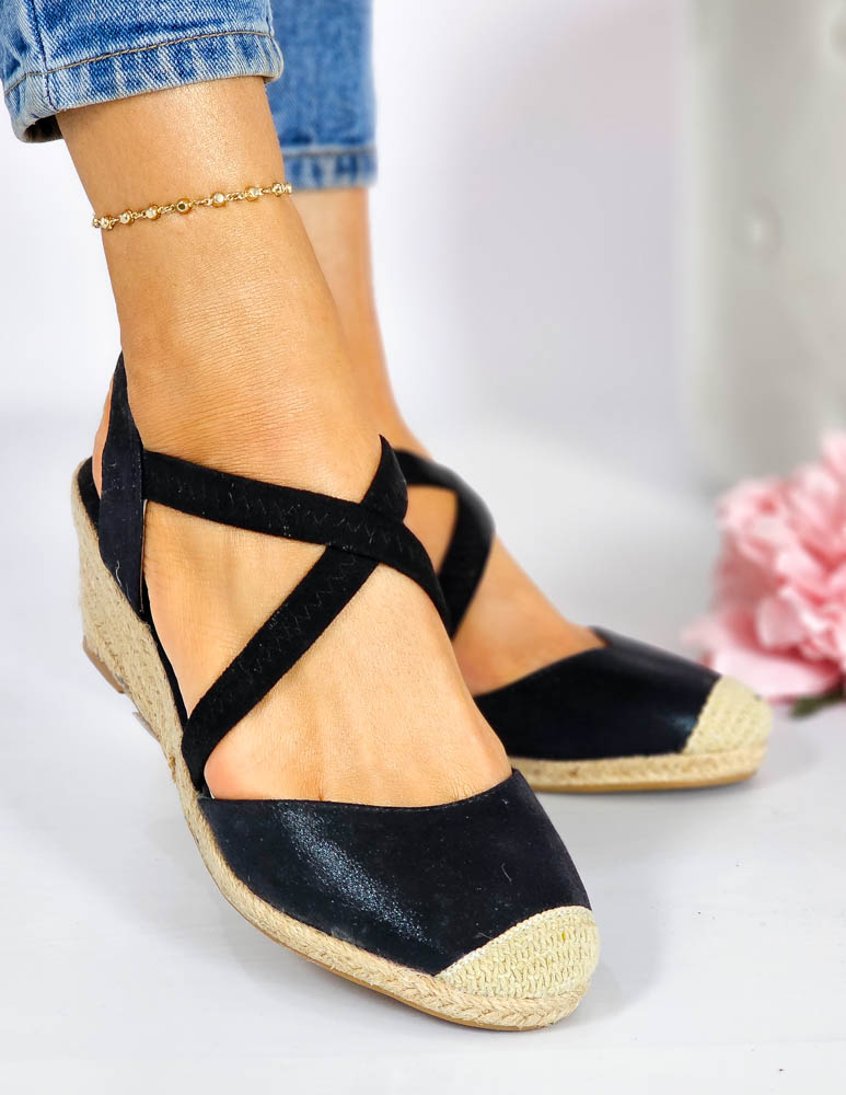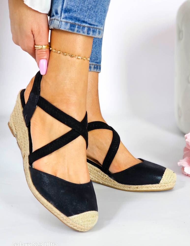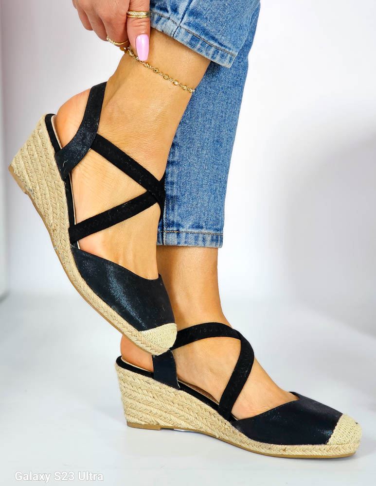 Czarne Sandały Na Niskiej Koturnie Na Gumki Gold