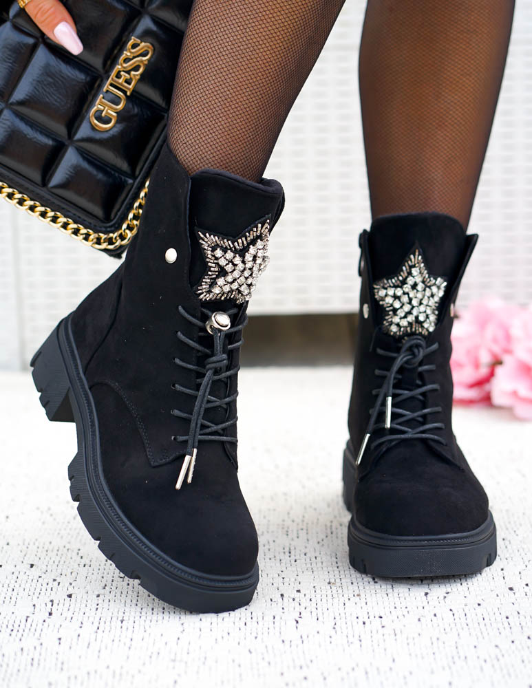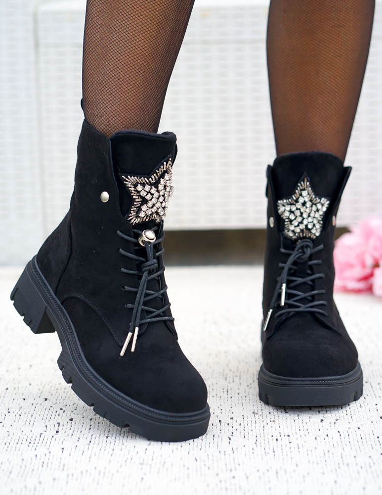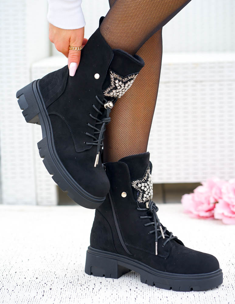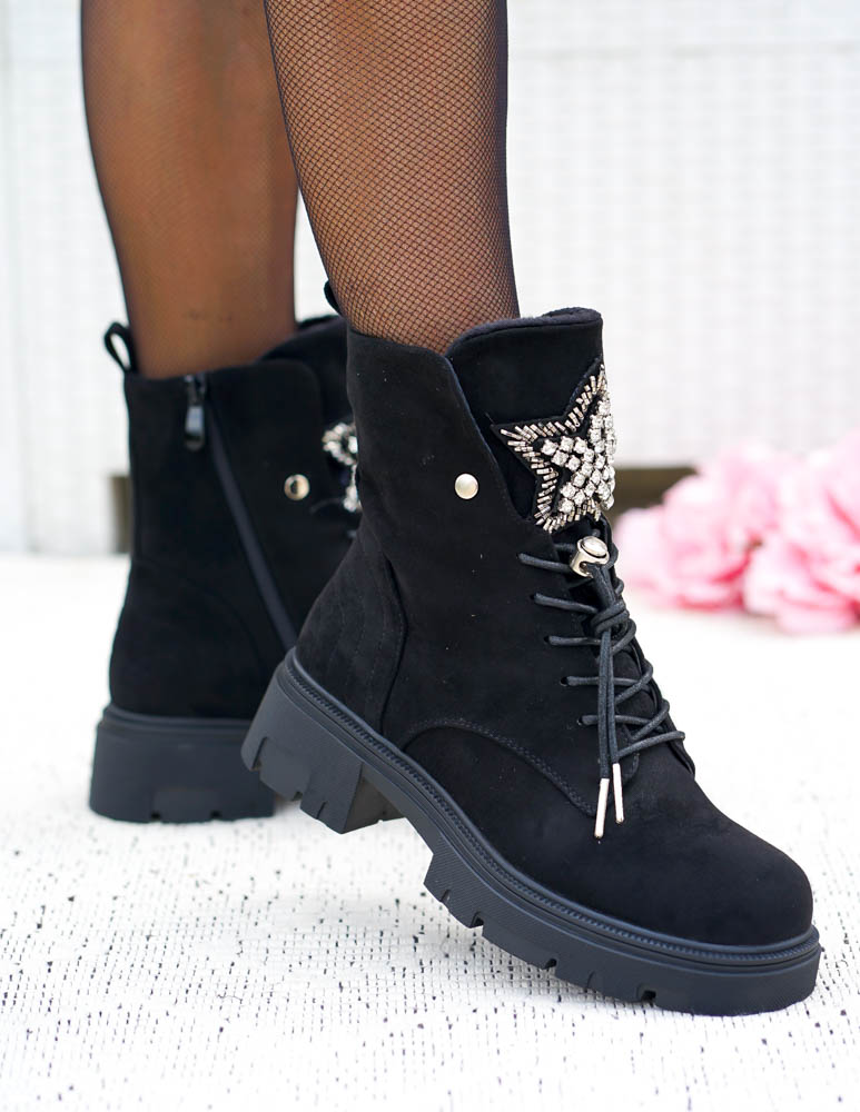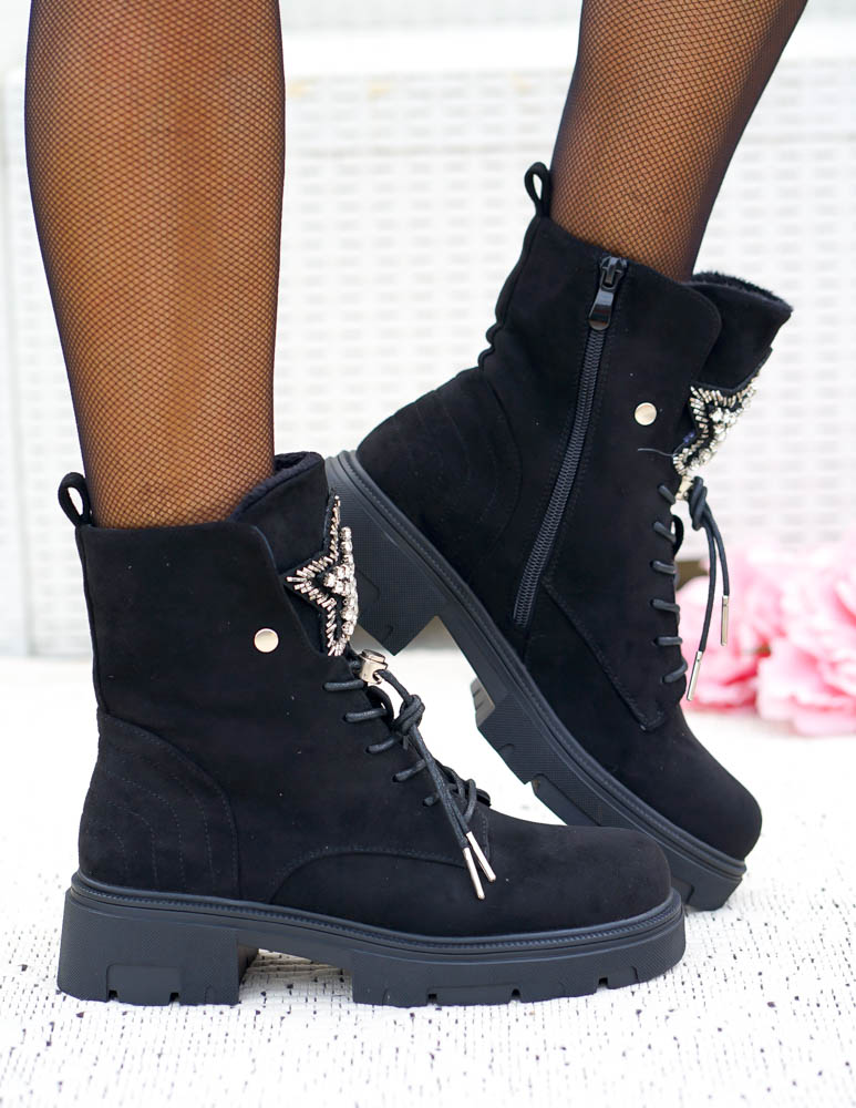 - Kod produktu: Czarne Zamszowe Botki Damskie z Ozdobą Sznurowane Prinss