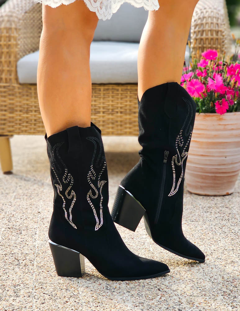 ❤ Modne i tanie buty on-line❤Klasyczne, czarne botki na niskim obcasie❤ Botki a`lla kowbojki ze..