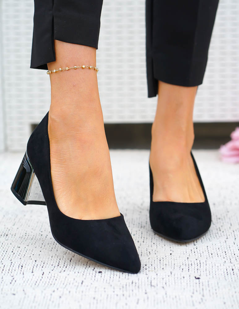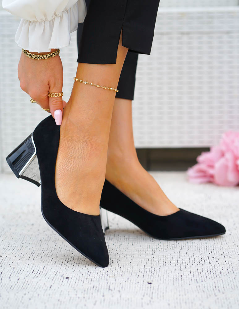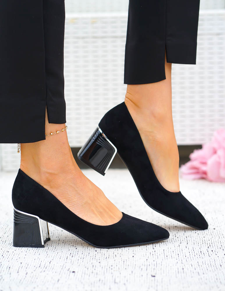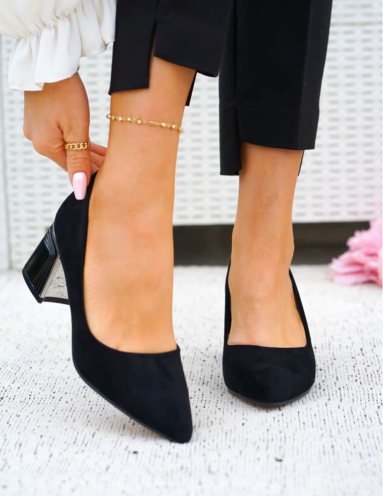 Eleganckie, czarne, zamszowe czółenka na niskim obcasie-słupku