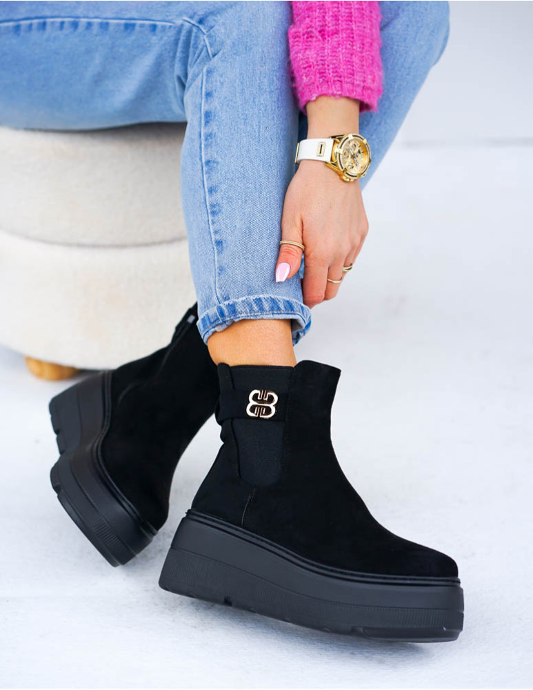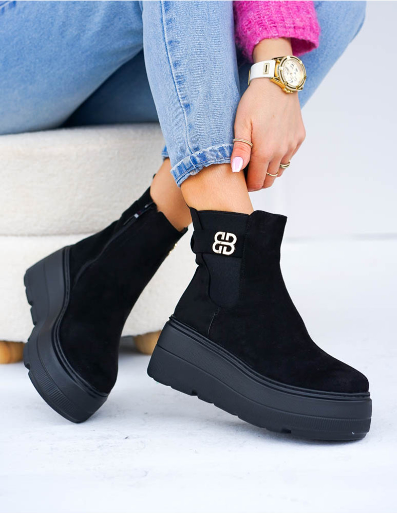 Czarne Zamszowe Eleganckie Botki Na Koturnie Sign