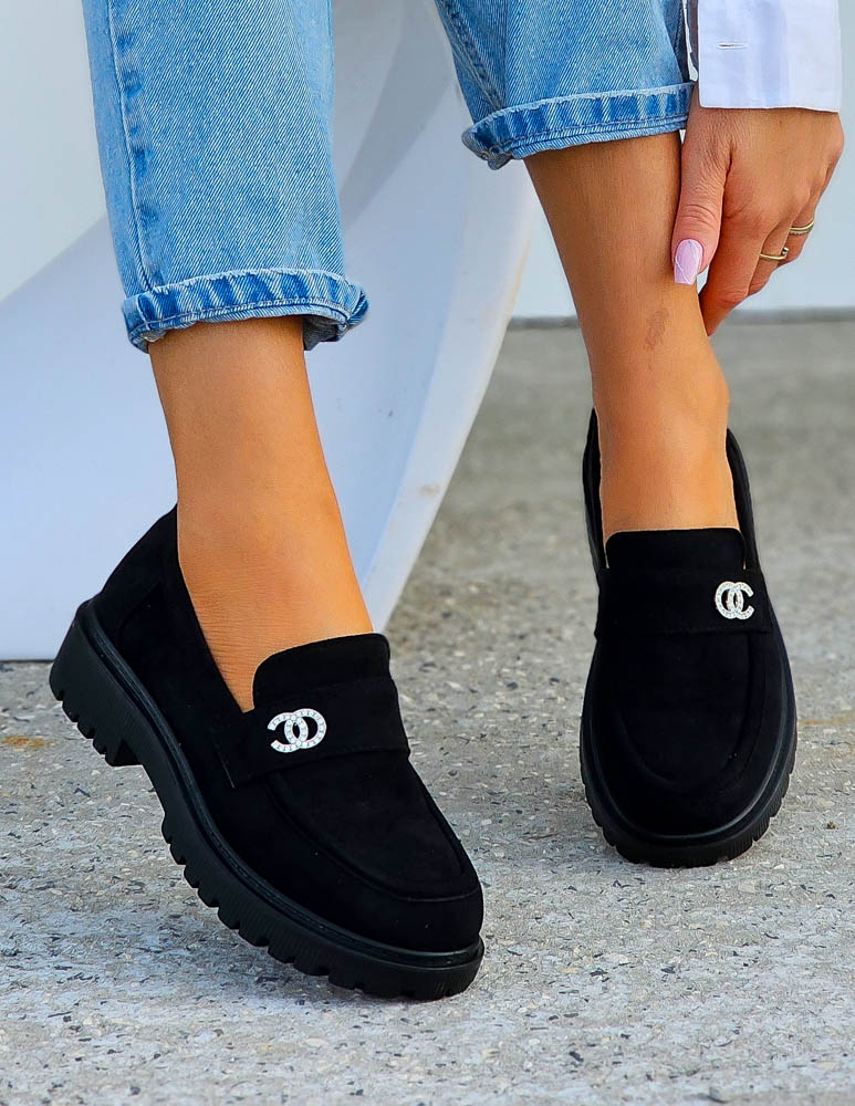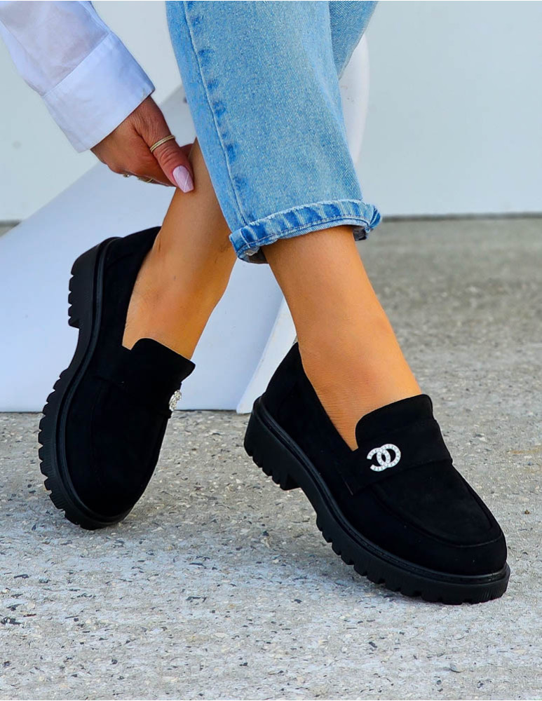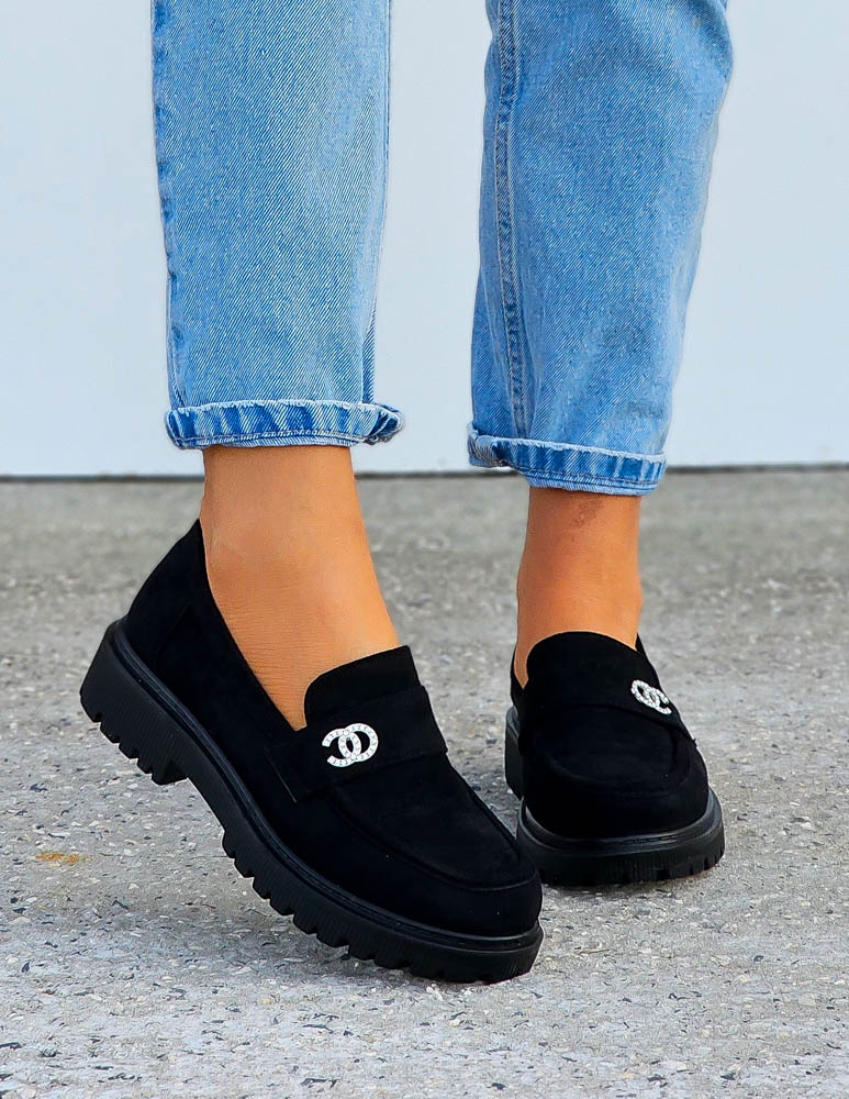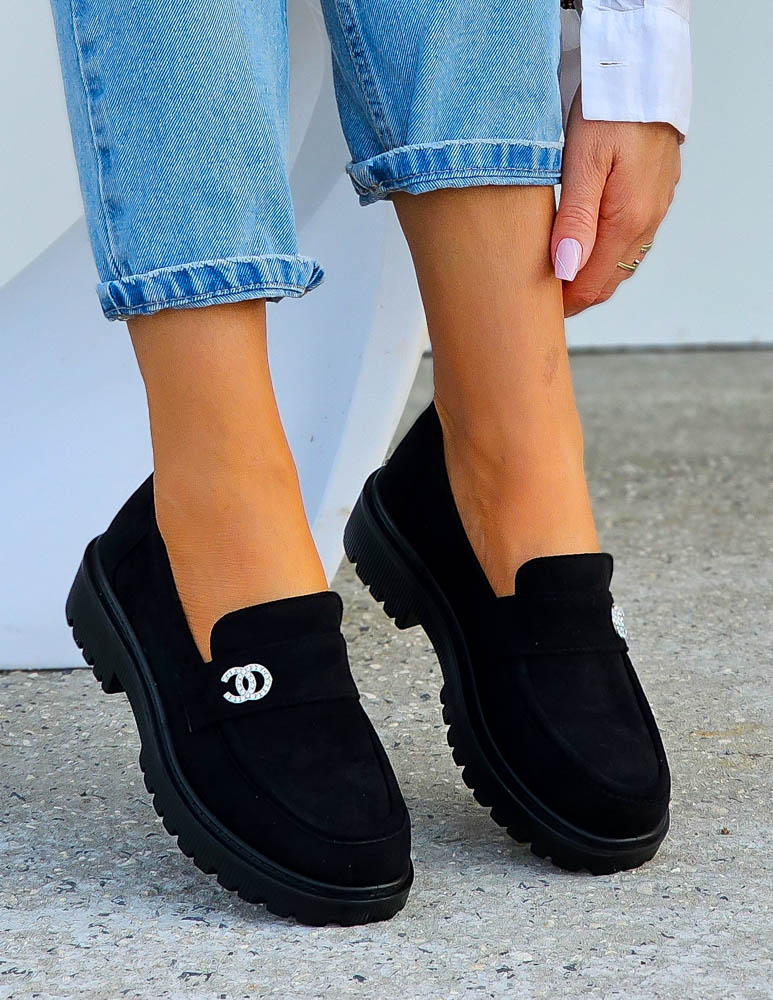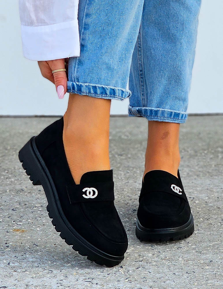 Eleganckie, czarne, zamszowe mokasyny na lekkim podwyższeniu z subtelną, polyskującą klamerką