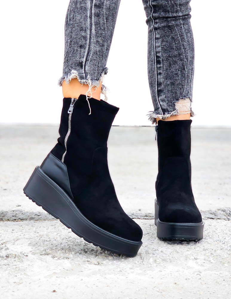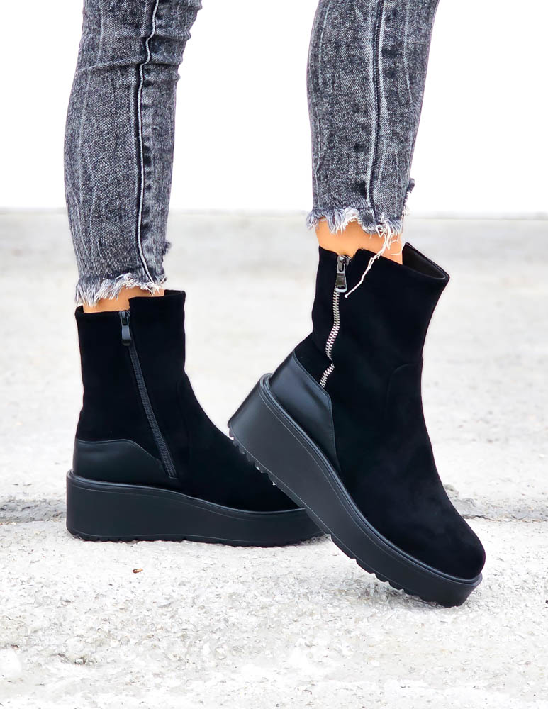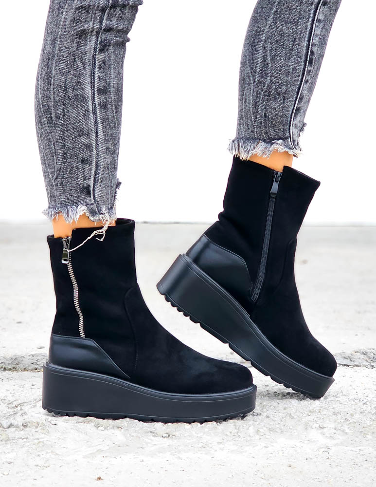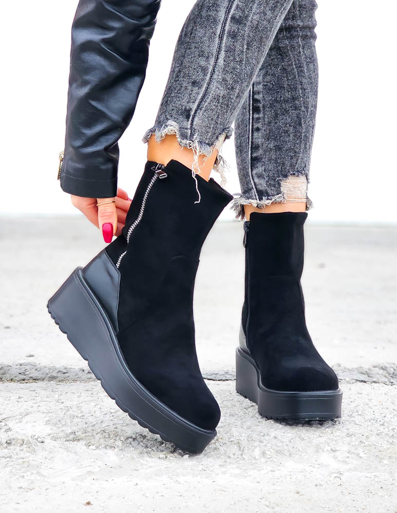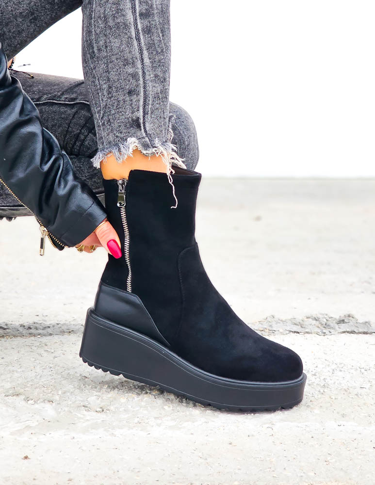 Krótkie Czarne Zamszowe Botki Na Koturnie Save