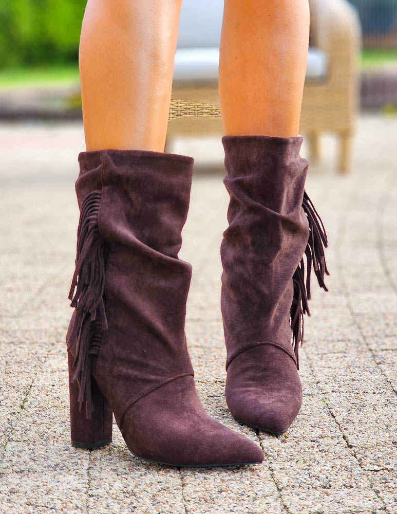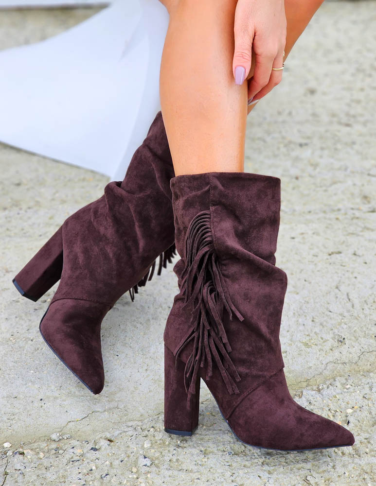 Czekoladowe Botki Kozaki Na Obcasie z Frędzlami