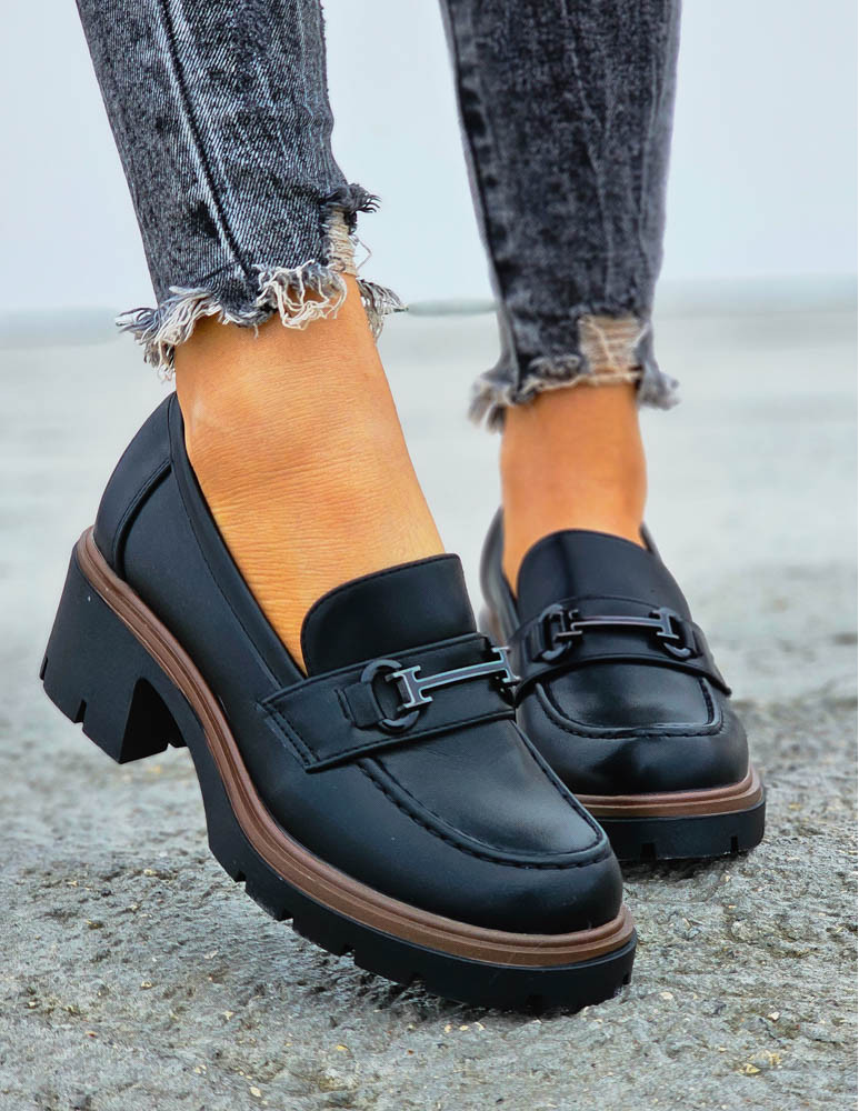 Eleganckie, czarne, skórzane mokasyny na lekkim podwyższeniu z subtelną klamerką