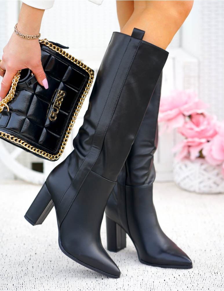- Kod produktu: Długie Czarne Kozaki Ze Skóry Na Obcasie Melanie