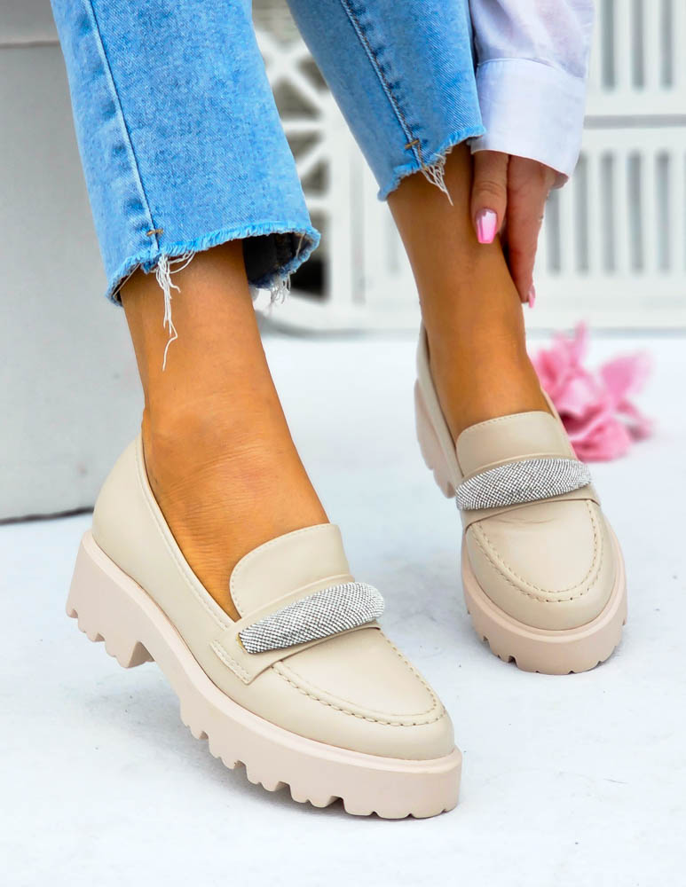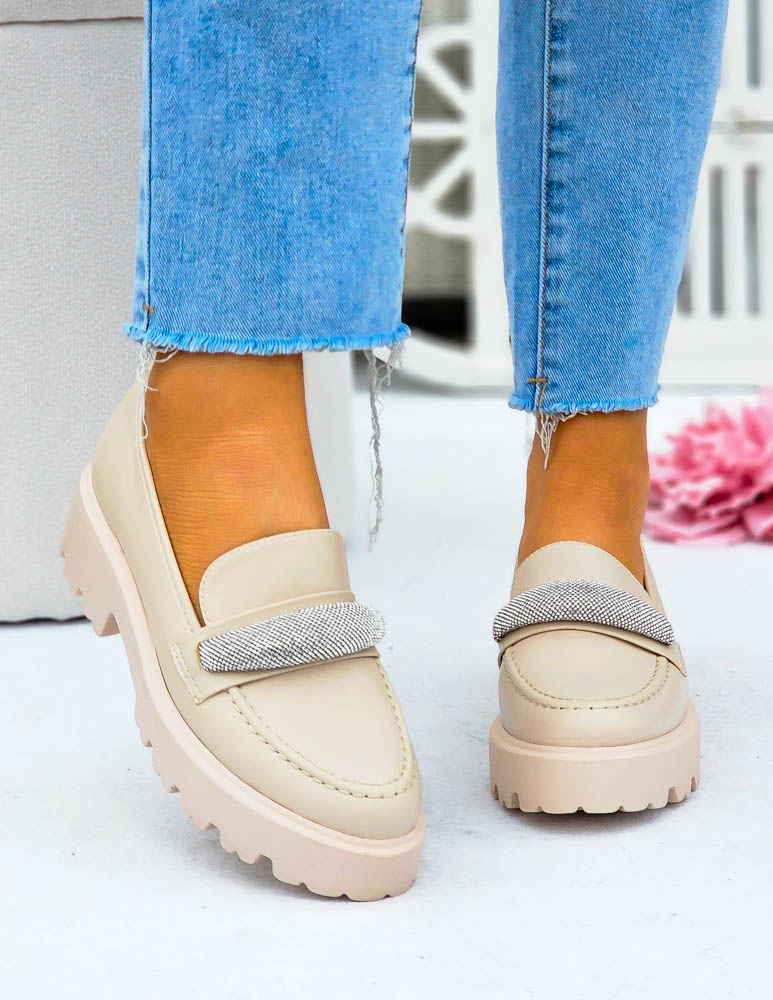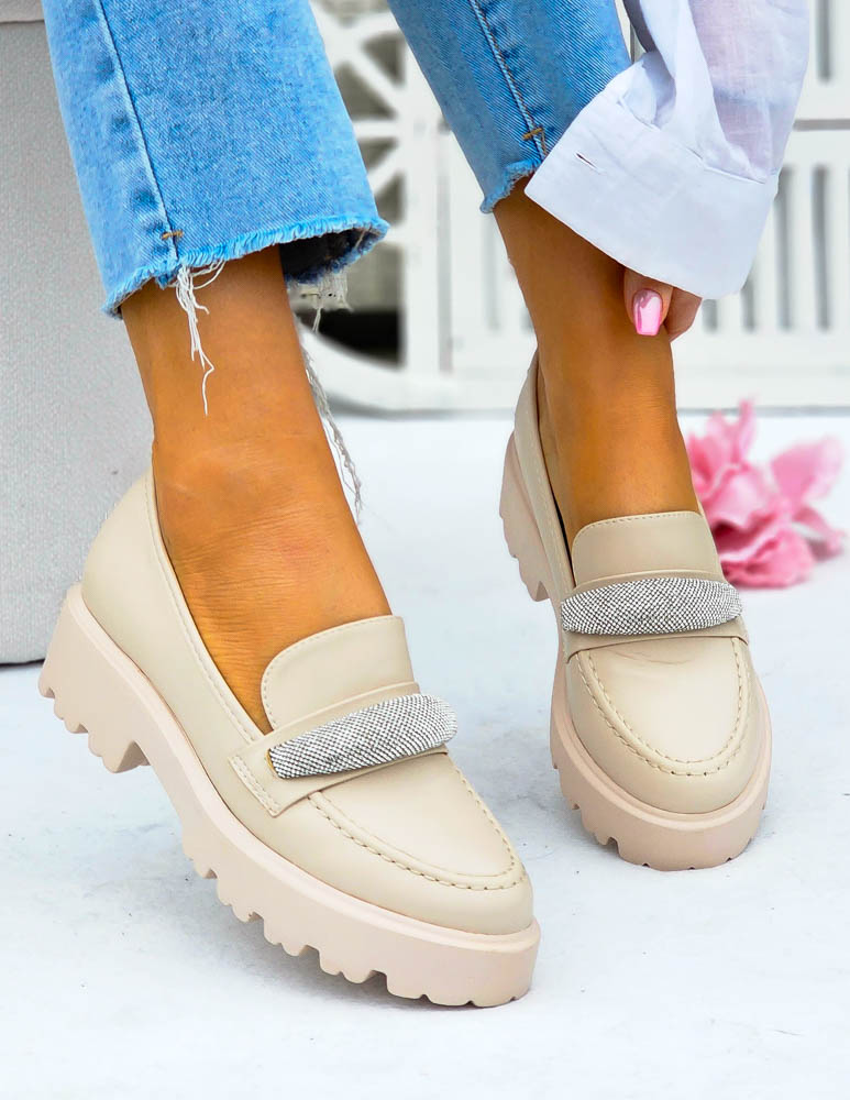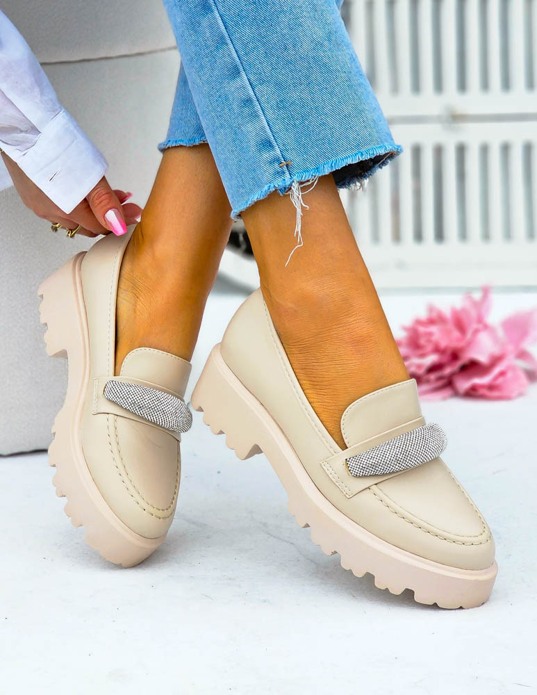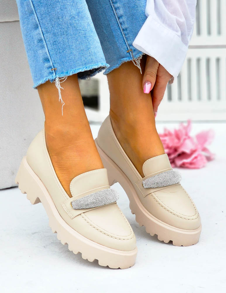 Modne, beżowe mokasyny z ozdobną diamentową klamrą. Buty posiadają grubą podeszwę.