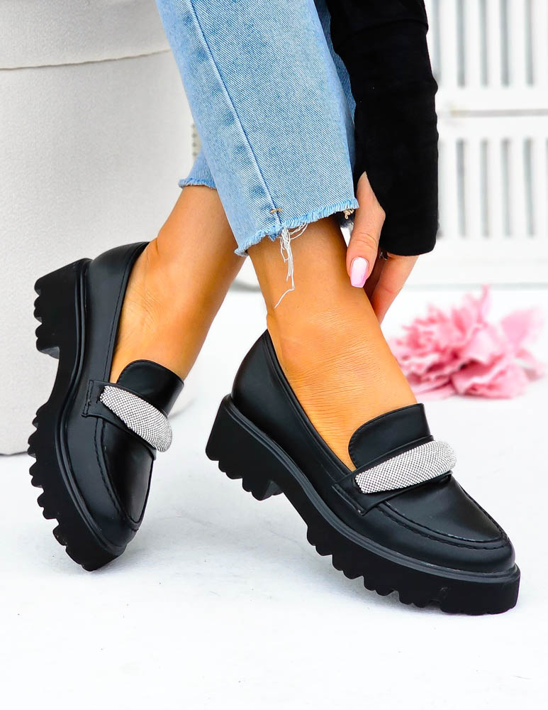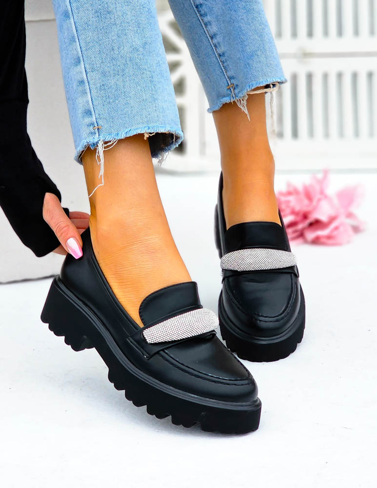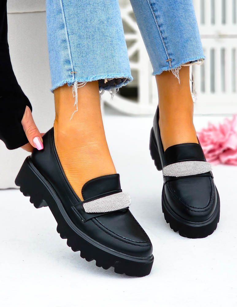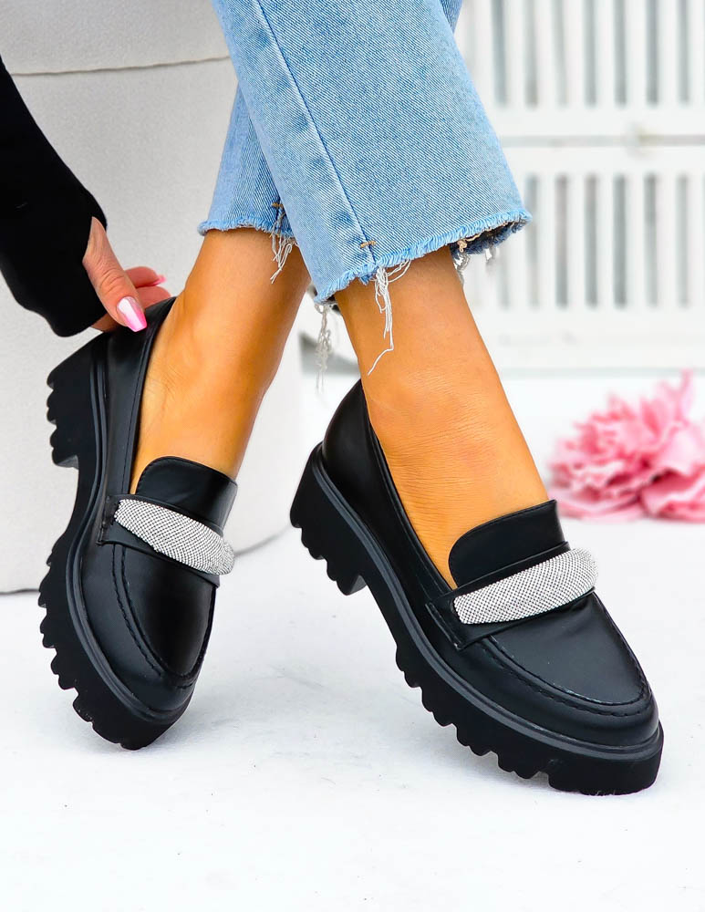 Modne, czarne mokasyny z ozdobną diamentową klamrą. Buty posiadają grubą podeszwę.