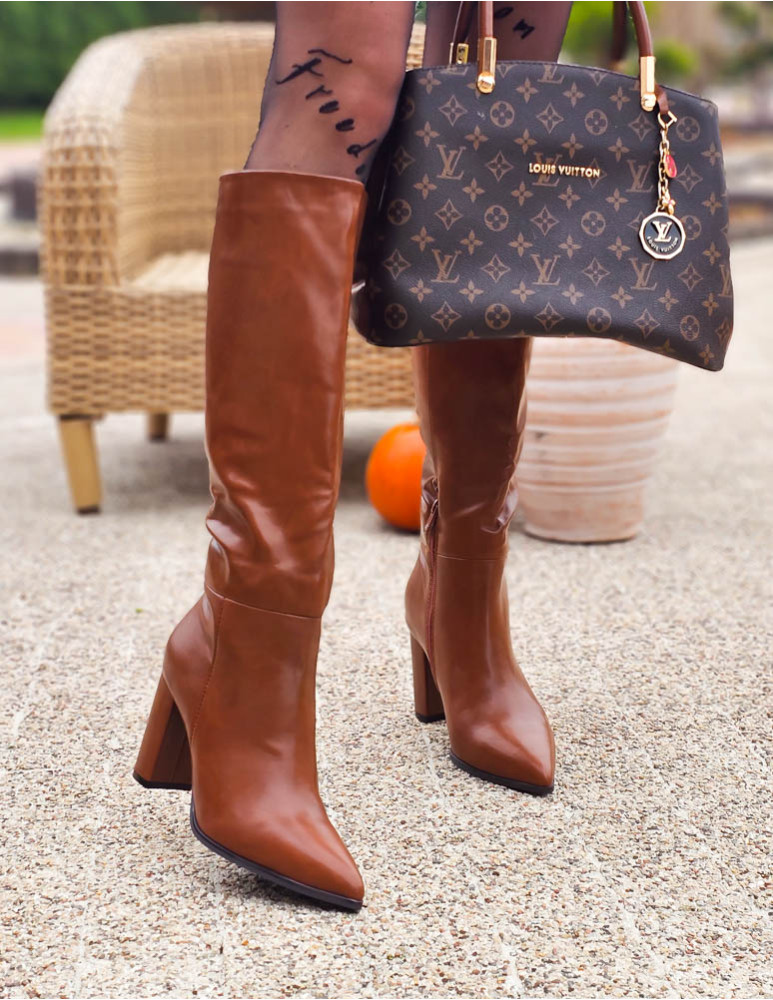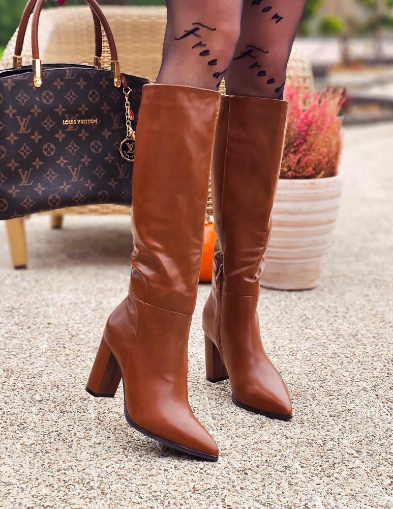 Brązowe Długie Kozaki Ze Skóry Na Obcasie Amari