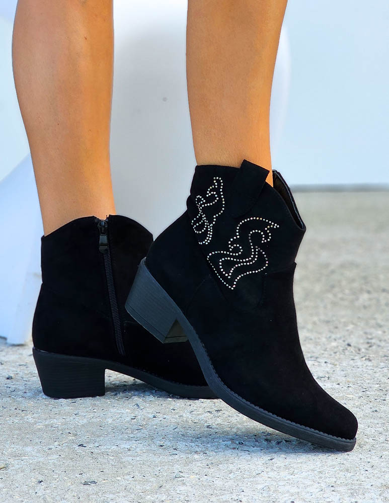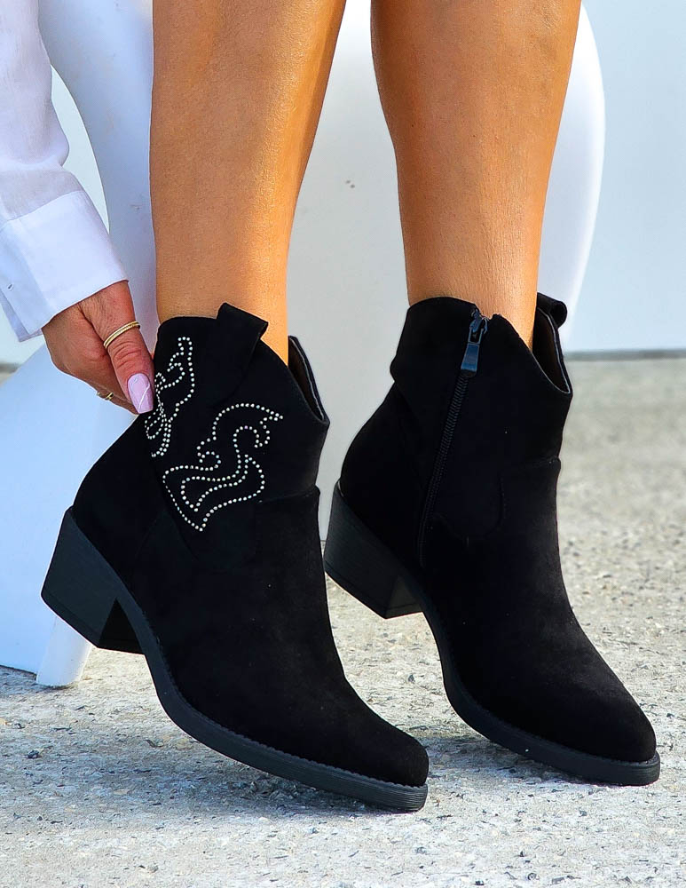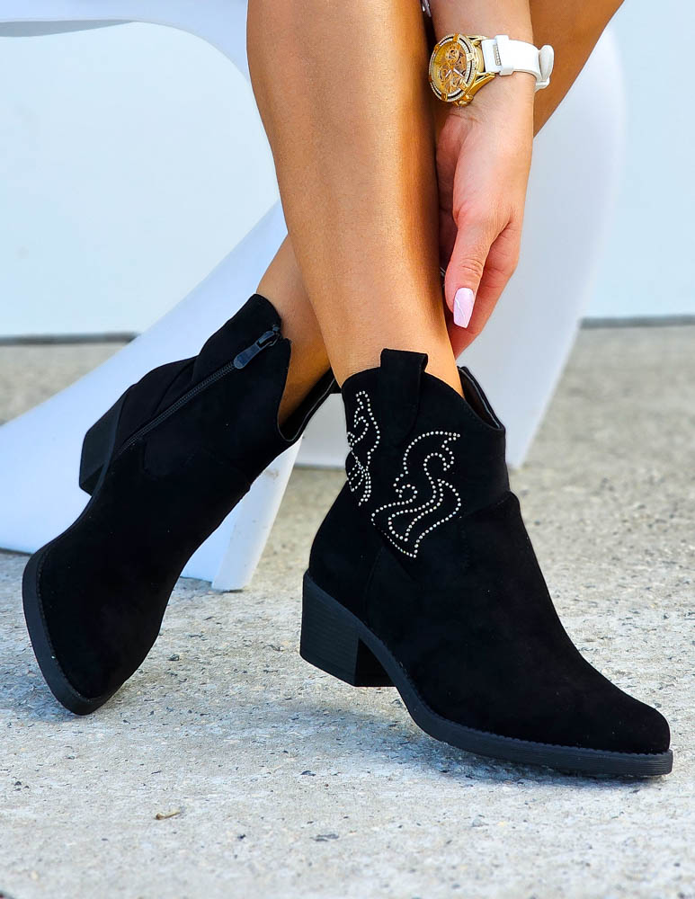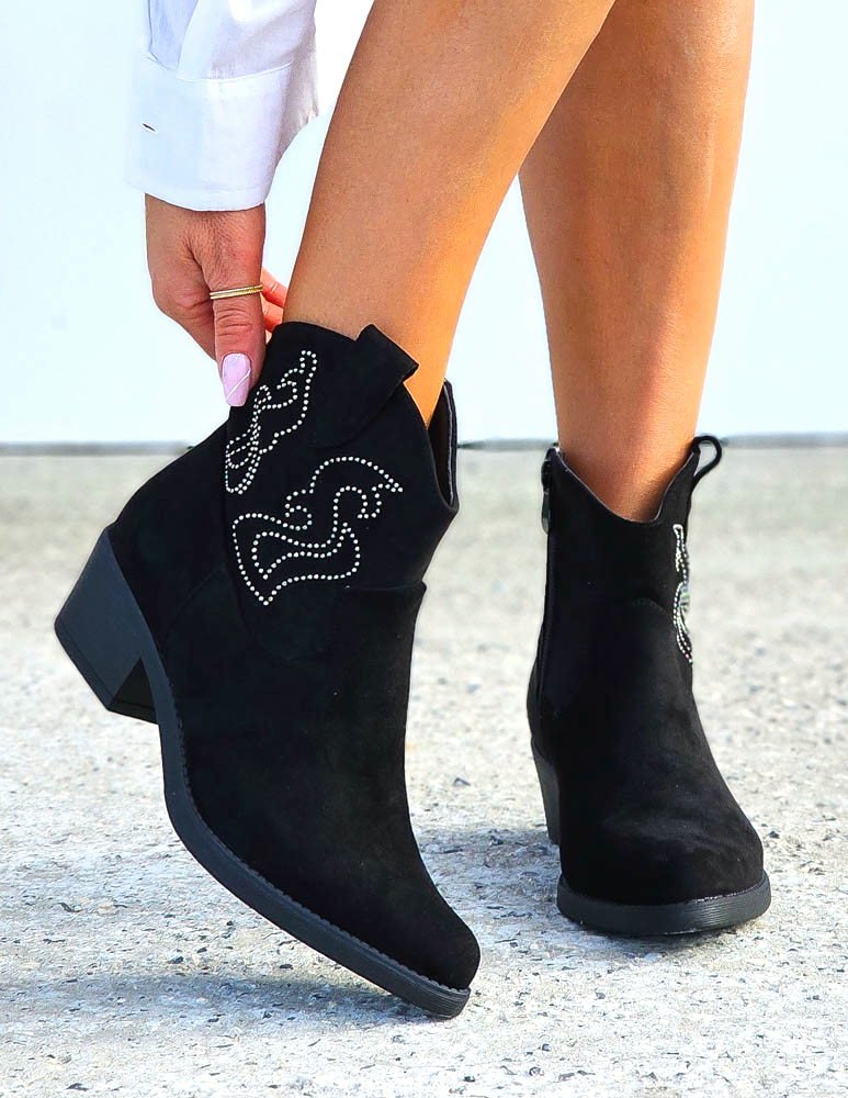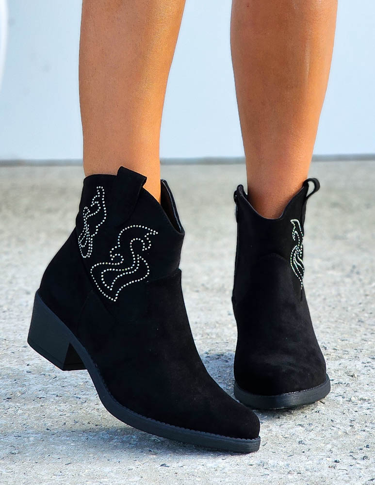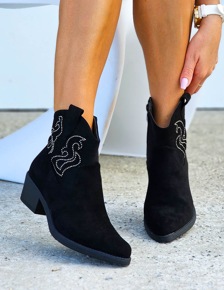 ❤ Modne i tanie buty on-line❤Klasyczne, czarne botki na niskim obcasie❤ Botki a`lla kowbojki ze..