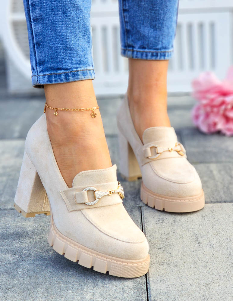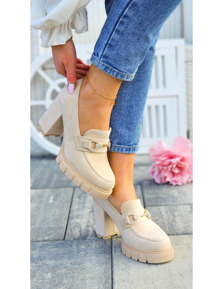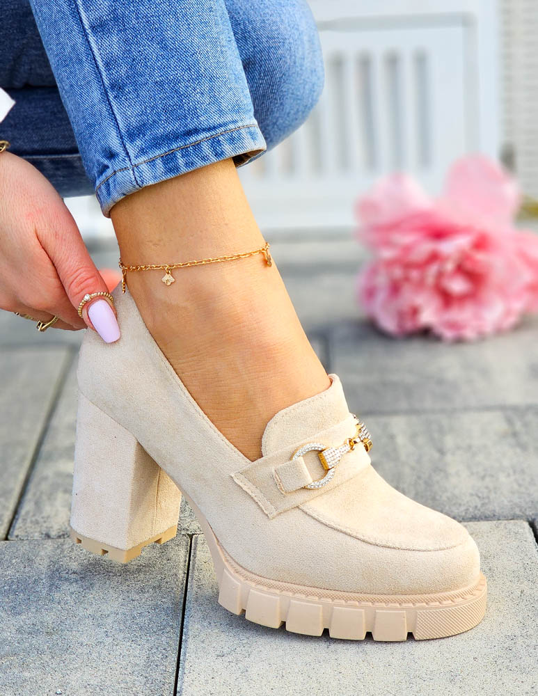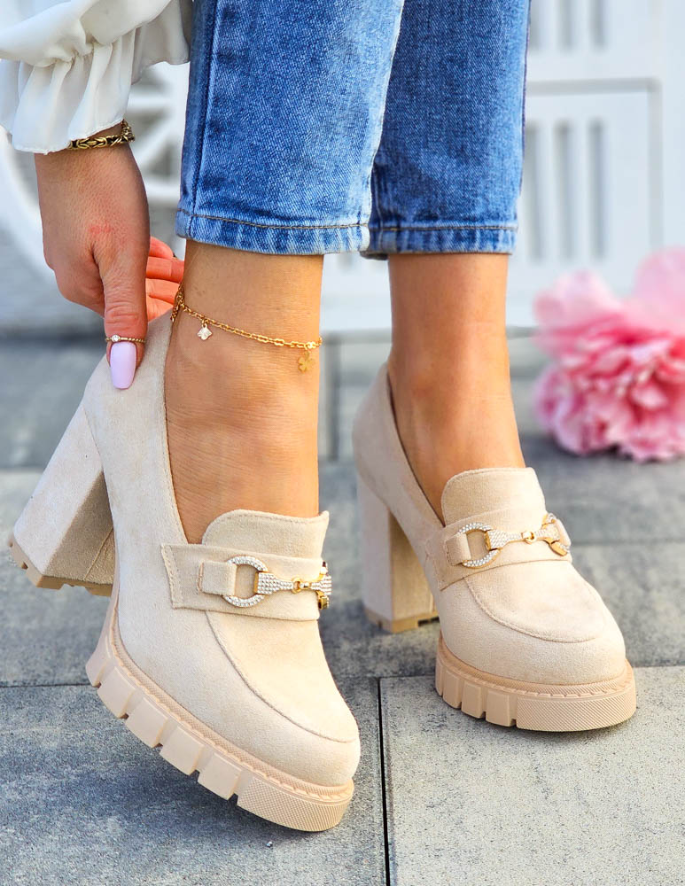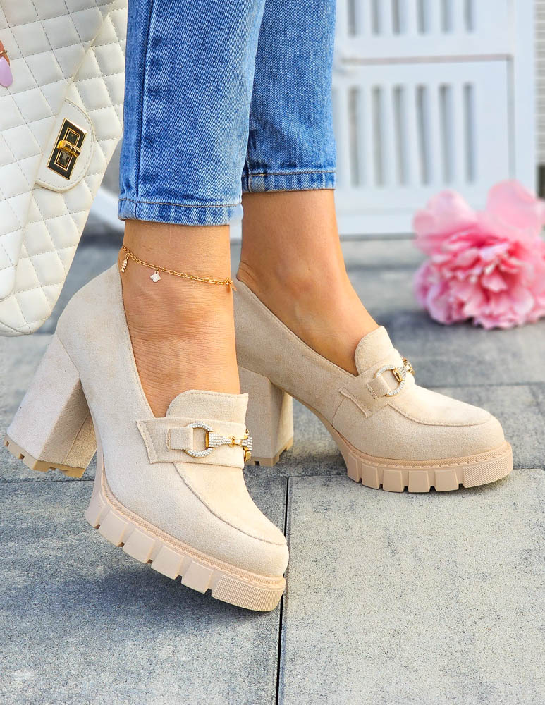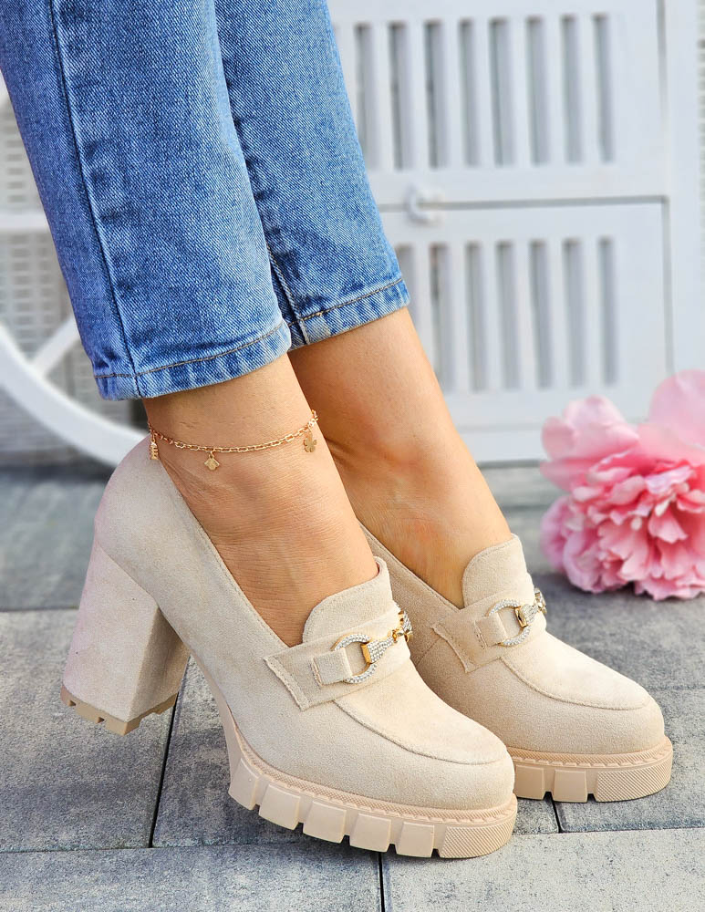 • Kod produktu: Jasno-Beżowe Zamszowe Półbuty Mokasyny Na Słupku Puerto
