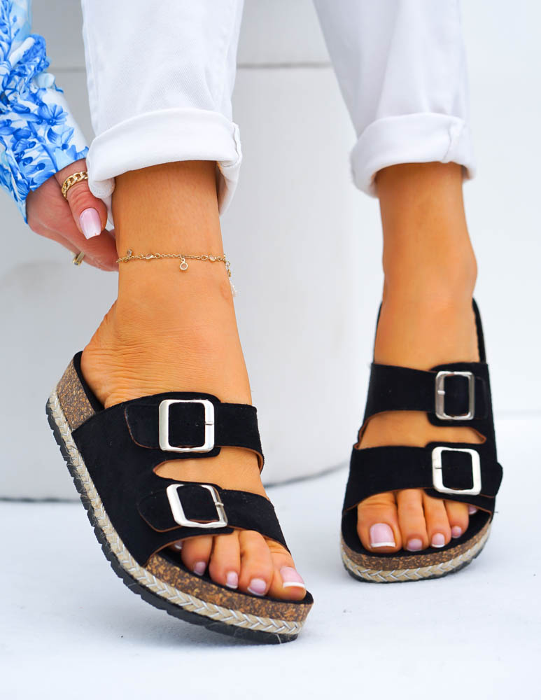 Czarne Klapki Na Paski Korkowa Podeszwa Florense