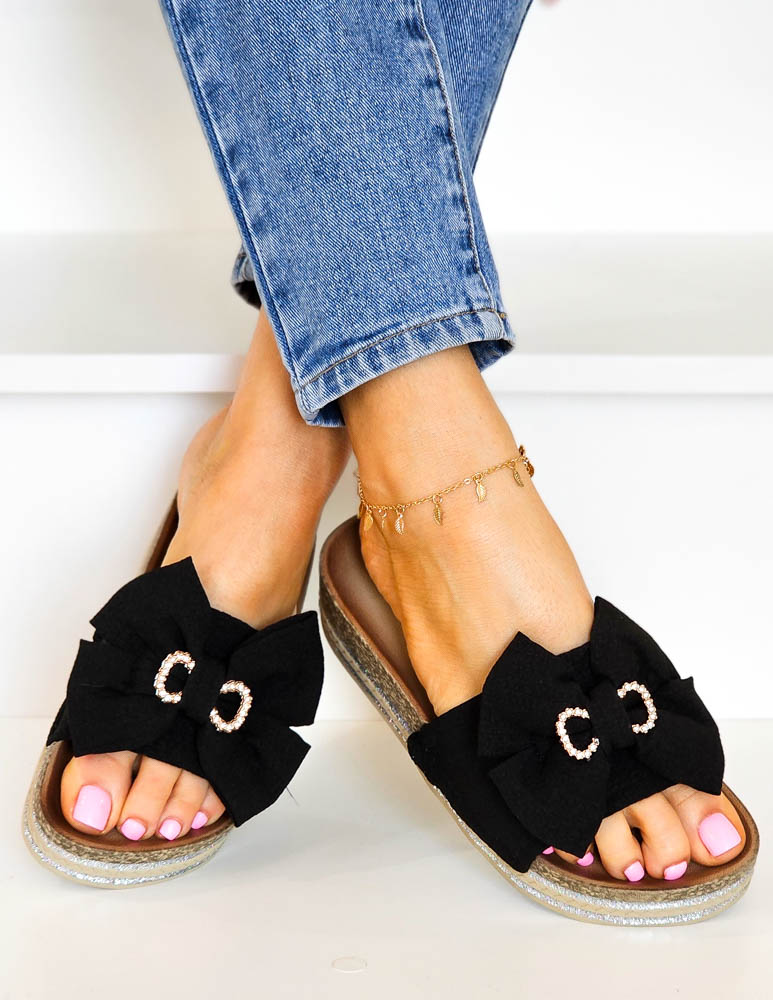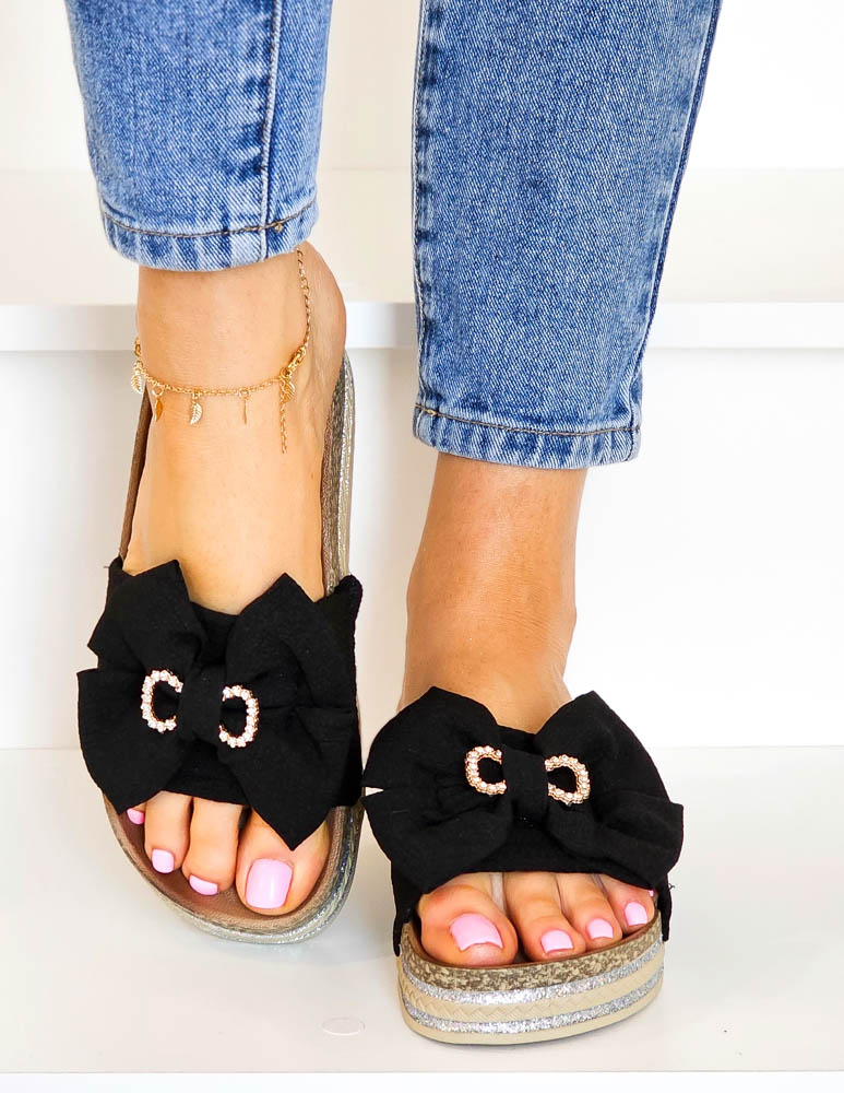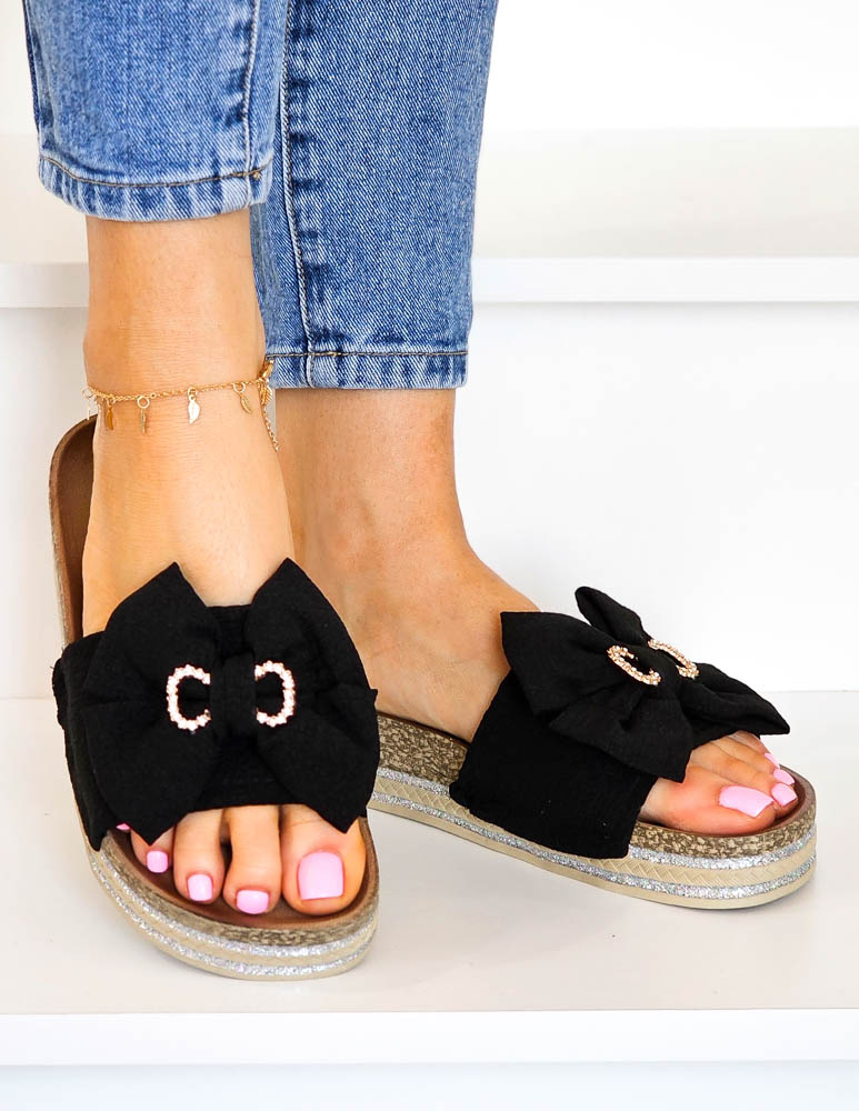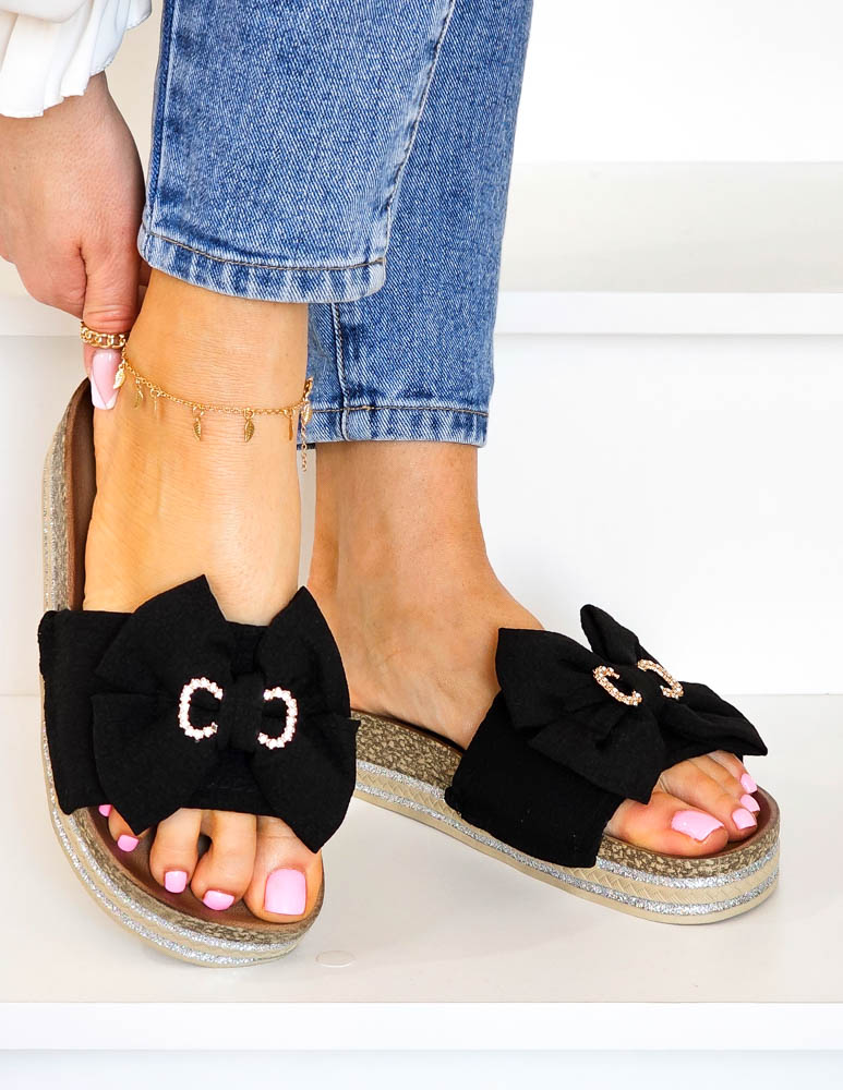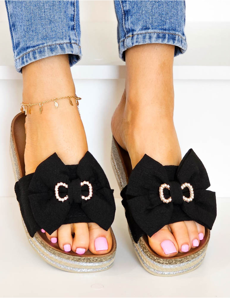 Czarne Klapki Na Grubej Korkowej Podeszwie Z Kokardą