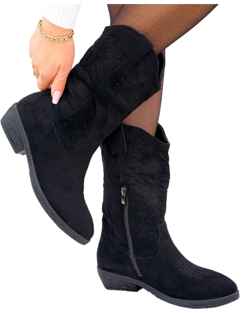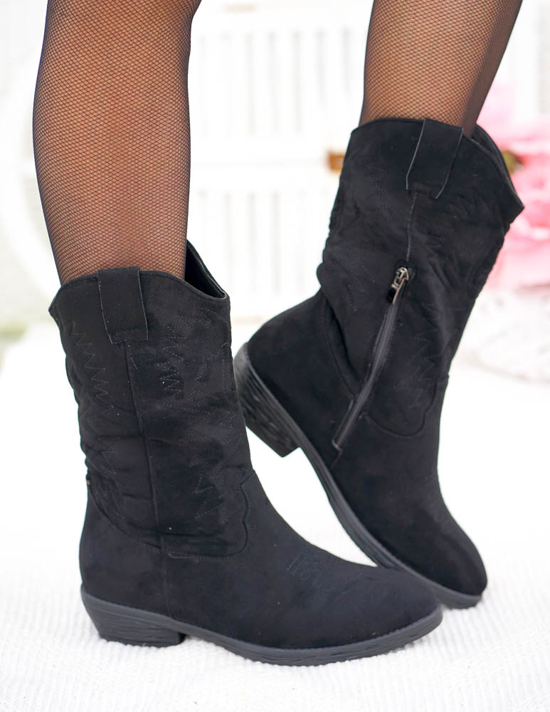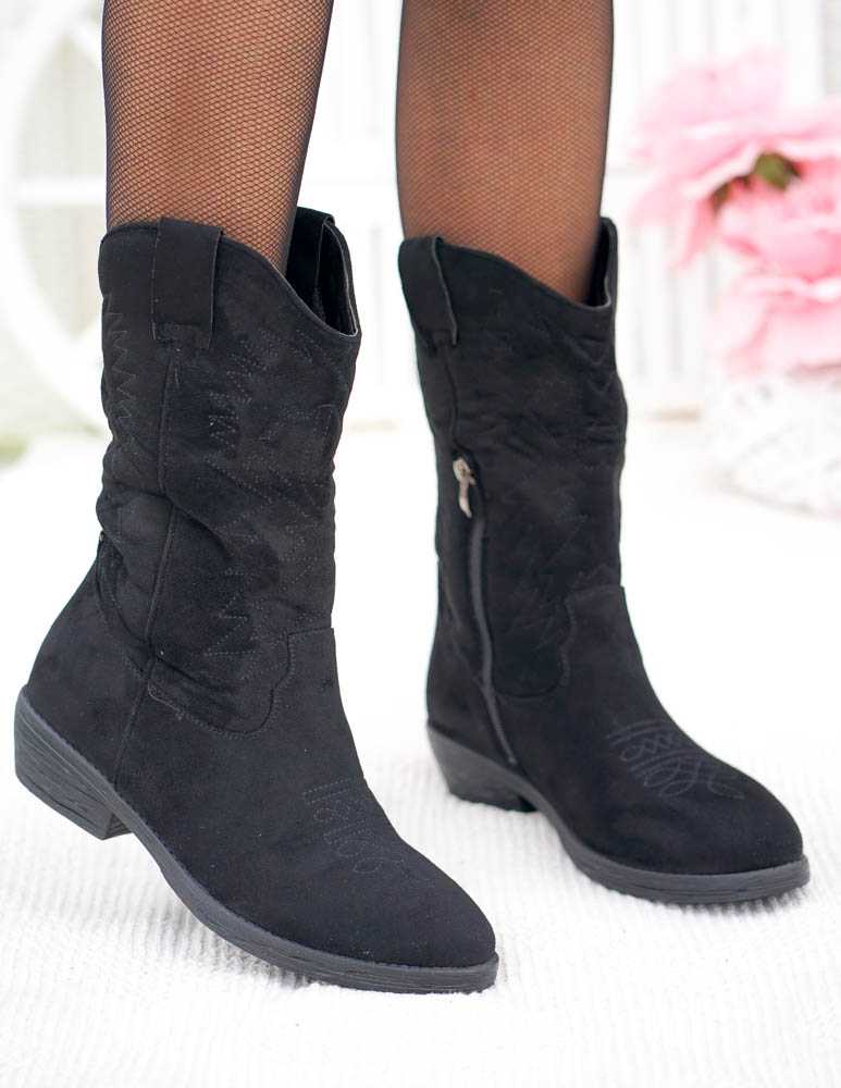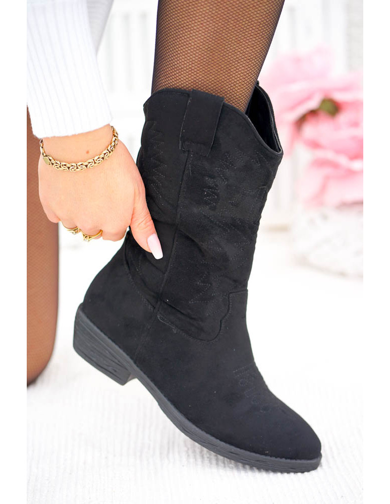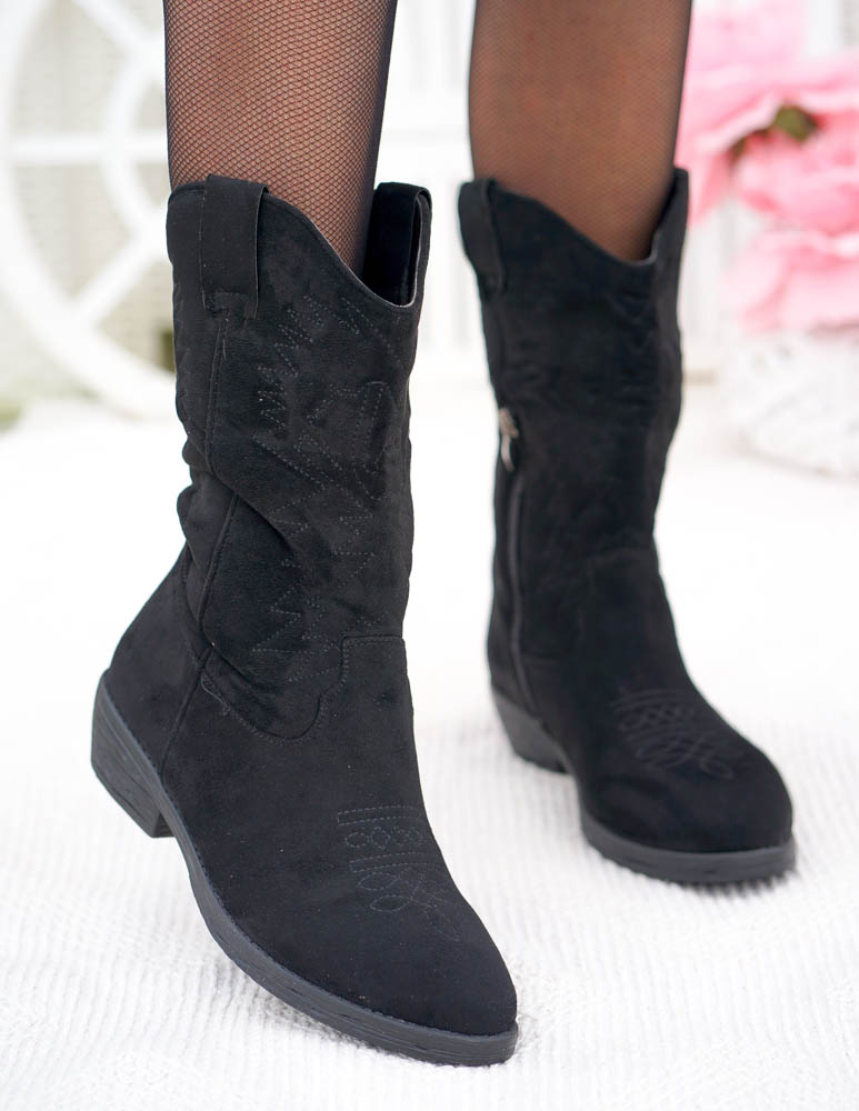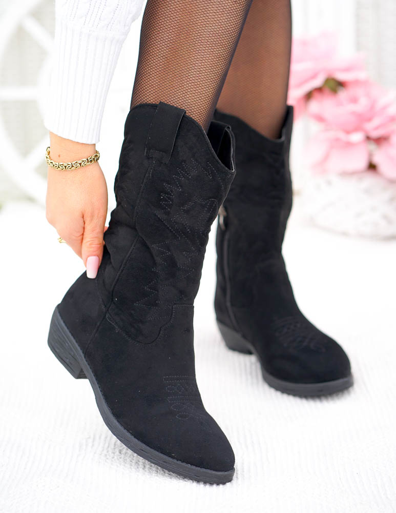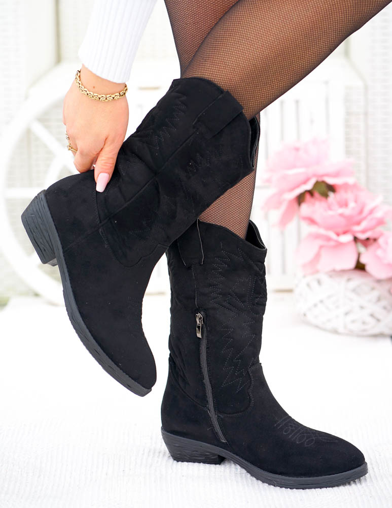 ❤ Modne i tanie buty on-line❤Klasyczne, czarne botki na niskim obcasie❤ Botki a`lla kowbojki ze..
