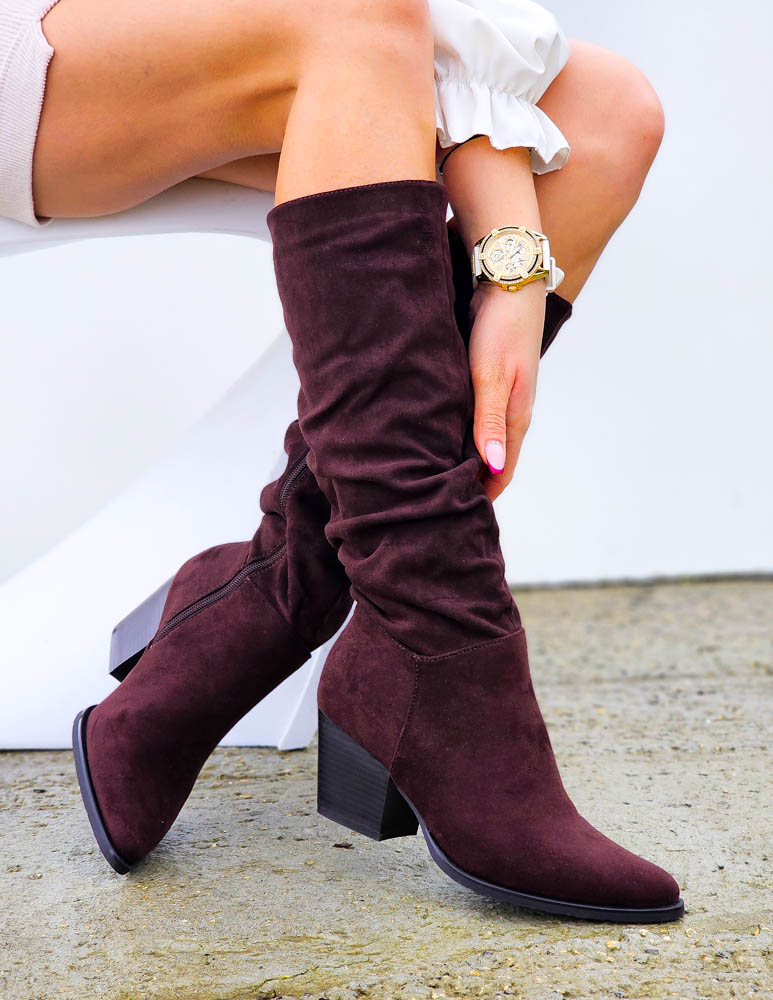 - Kod produktu: Czekoladowe Zamszowe Kozaki Na Klocku Suzan