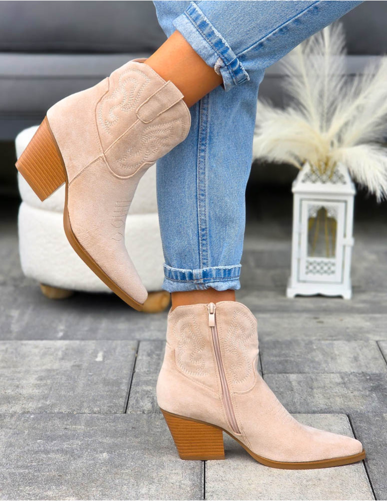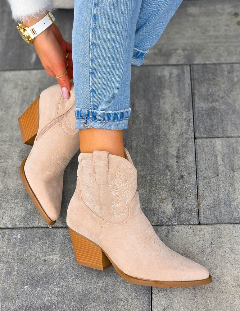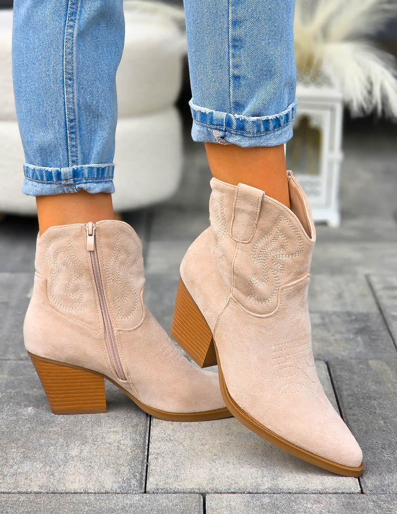 Beżowe Zamszowe Botki Kowbojki Damskie Loren