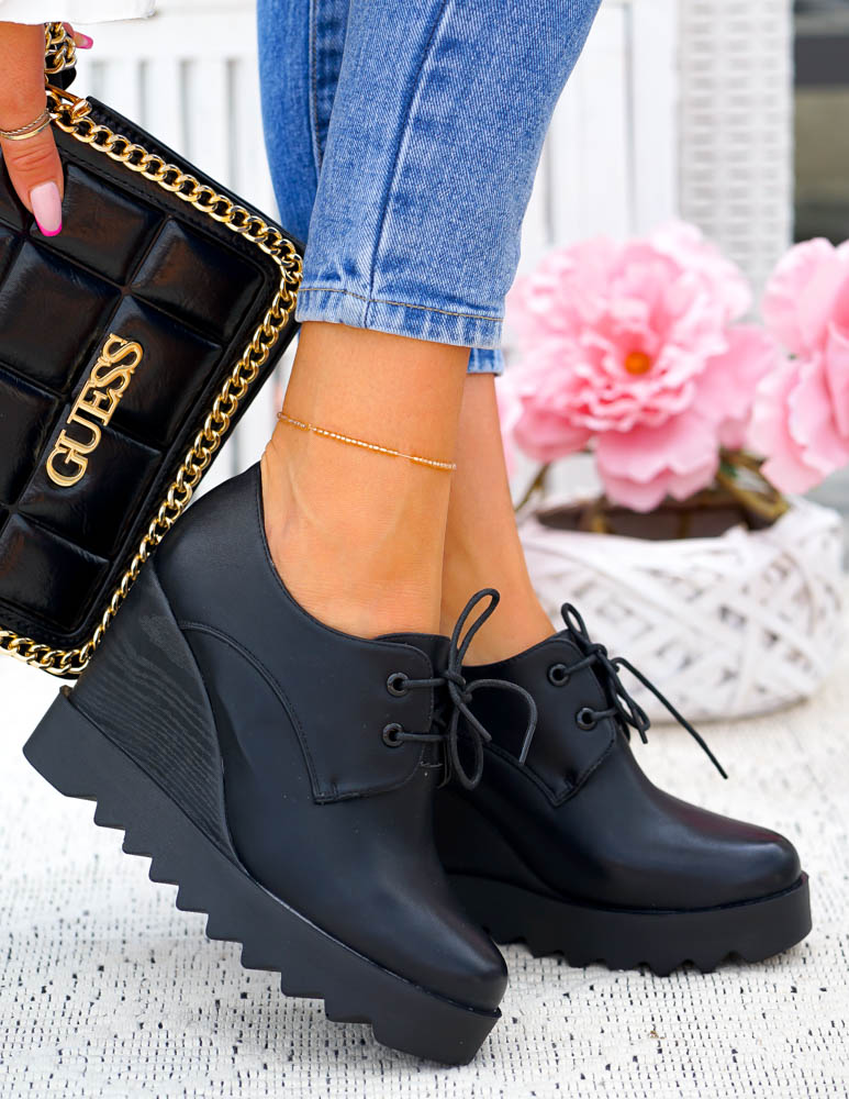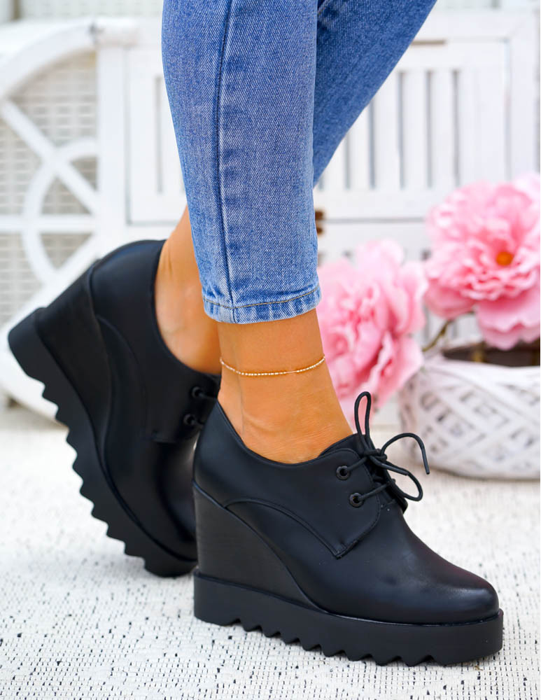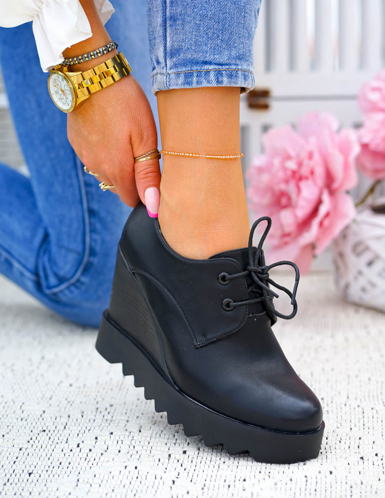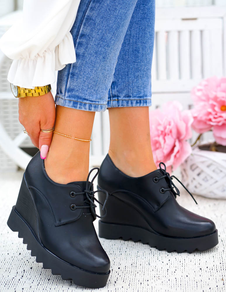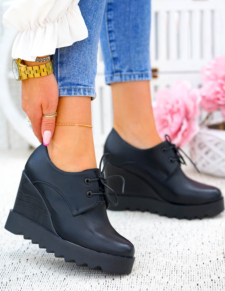 Krótkie Czarne Sznurowane Botki Na Koturnie Inez