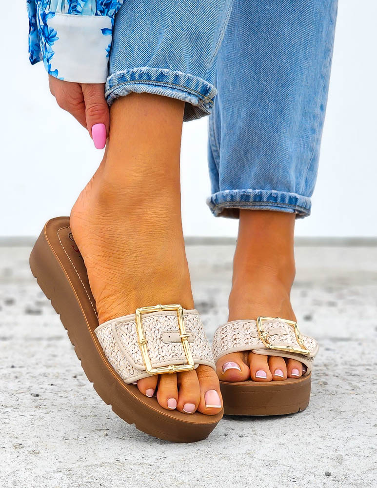 • Kod produktu: Lekkie Beżowe Klapki Na Koturnie z Klamerką