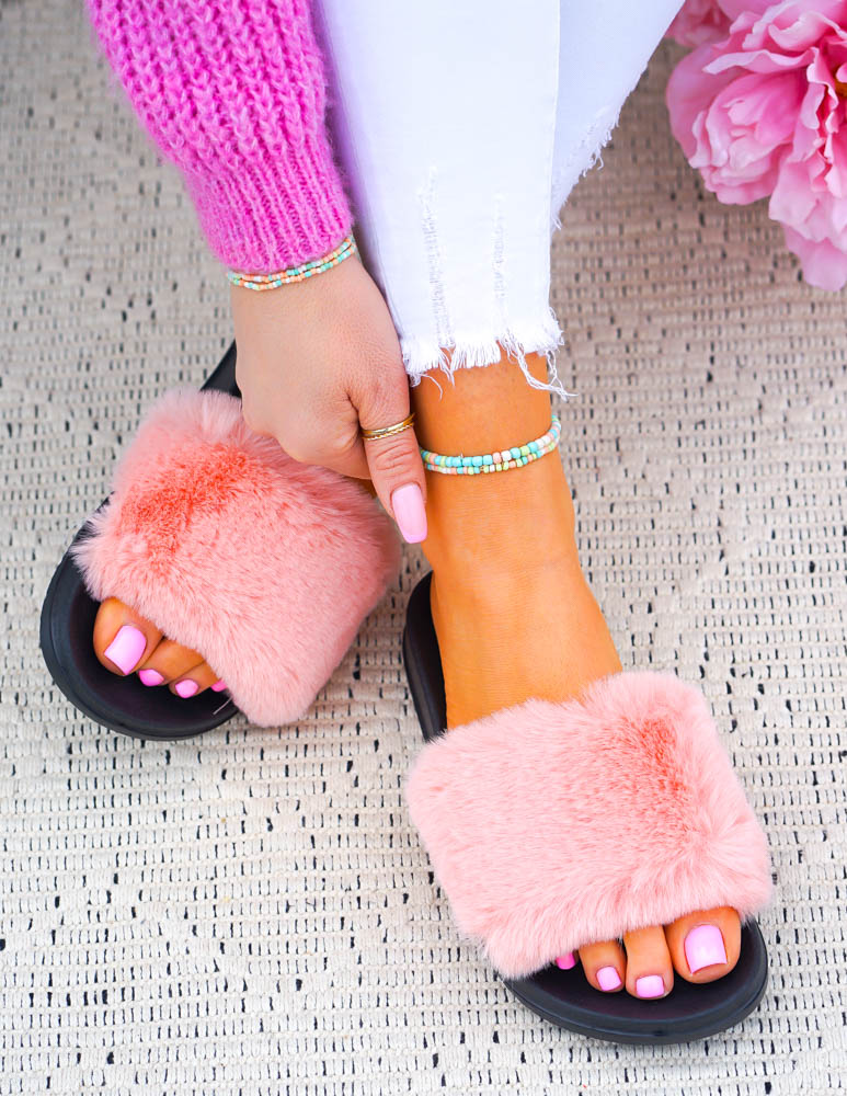 Dostępne w łososiowymkolorze. Klapki posiadają szeroki pasek z miłym futerkiem.
